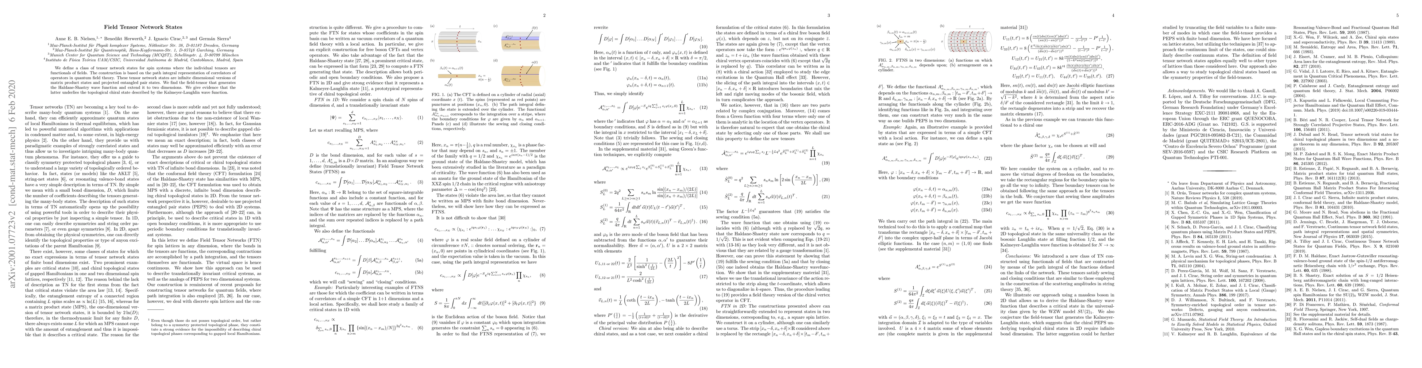 We define a class of tensor network states for spin systems where the individual tensors are functionals of fields. The construction is based on the path integral representation of correlators of operators in quantum field theory. These tensor network states are infinite dimensional versions of matrix product states and projected entangled pair states. We find the field-tensor that generates the Haldane-Shastry wave function and extend it to two dimensions. We give evidence that the latter underlies the topological chiral state described by the Kalmeyer-Laughlin wave function.