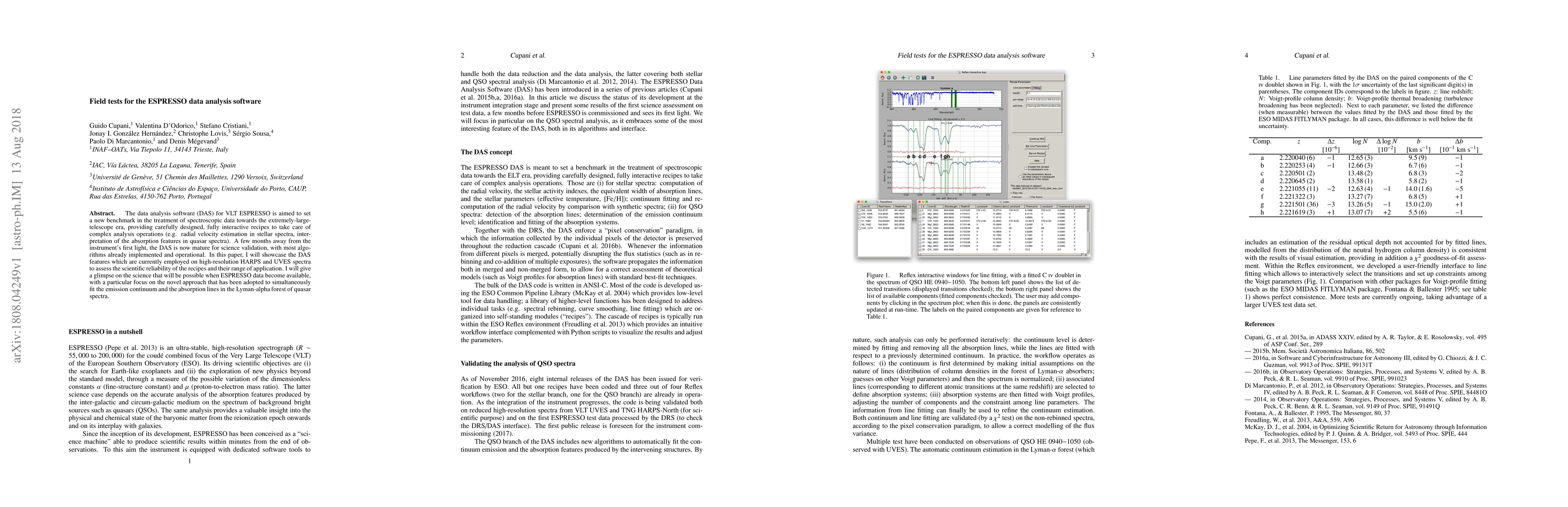 This paper evaluates the ESPRESSO data analysis software (DAS) for its ability to handle complex spectroscopic data, showcasing its features and algorithms through high-resolution spectra from HARPS and UVES. It highlights the software's potential for groundbreaking science, particularly in fitting both emission continuum and absorption lines in quasar spectra.