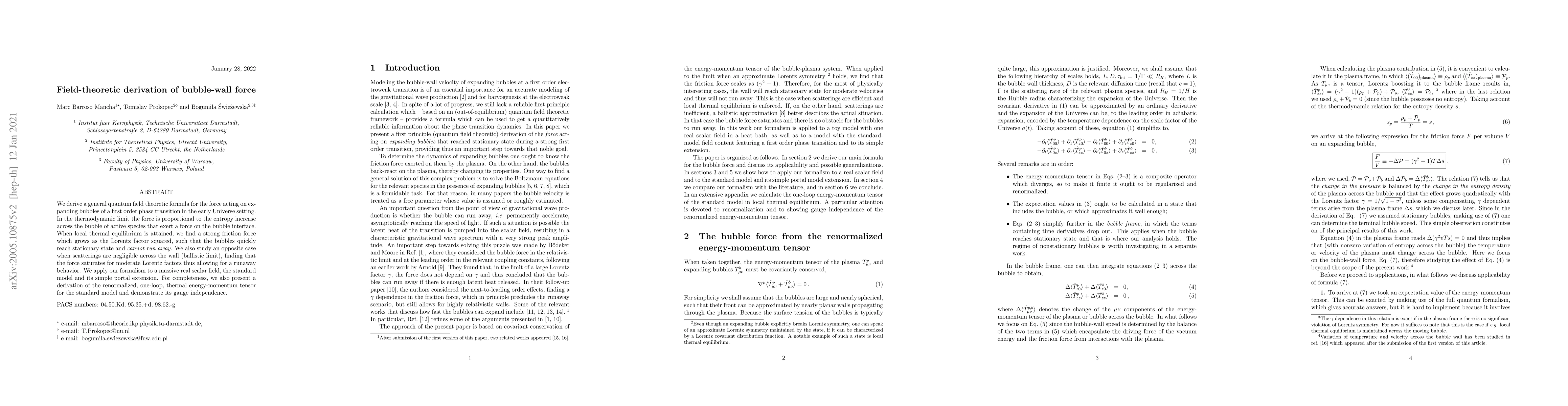 We derive a general quantum field theoretic formula for the force acting on expanding bubbles of a first order phase transition in the early Universe setting. In the thermodynamic limit the force is proportional to the entropy increase across the bubble of active species that exert a force on the bubble interface. When local thermal equilibrium is attained, we find a strong friction force which grows as the Lorentz factor squared, such that the bubbles quickly reach stationary state and cannot run away. We also study an opposite case when scatterings are negligible across the wall (ballistic limit), finding that the force saturates for moderate Lorentz factors thus allowing for a runaway behavior. We apply our formalism to a massive real scalar field, the standard model and its simple portal extension. For completeness, we also present a derivation of the renormalized, one-loop, thermal energy-momentum tensor for the standard model and demonstrate its gauge independence.