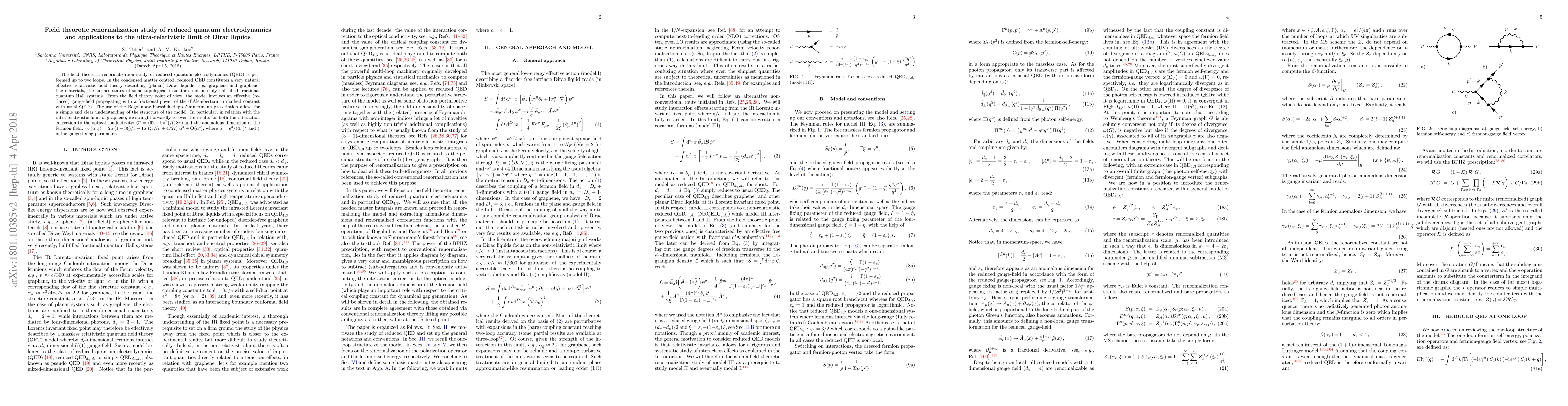 This paper studies the renormalization of reduced quantum electrodynamics (QED) up to two loops, applying it to describe Dirac liquids like graphene. It uses the BPHZ prescription to derive interaction corrections and anomalous dimensions in the ultra-relativistic limit, yielding specific results for optical conductivity and fermion field scaling.