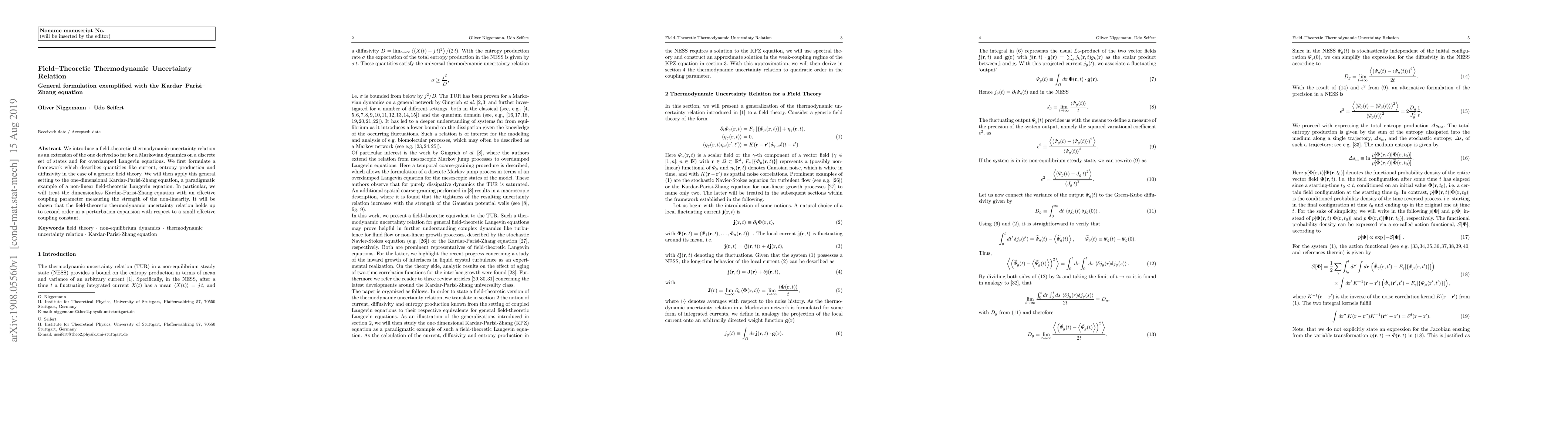 This paper formulates a field-theoretic thermodynamic uncertainty relation for non-linear field theories, exemplified by the Kardar-Parisi-Zhang equation. The authors demonstrate that this relation holds up to second order in a perturbation expansion with respect to a small effective coupling constant.