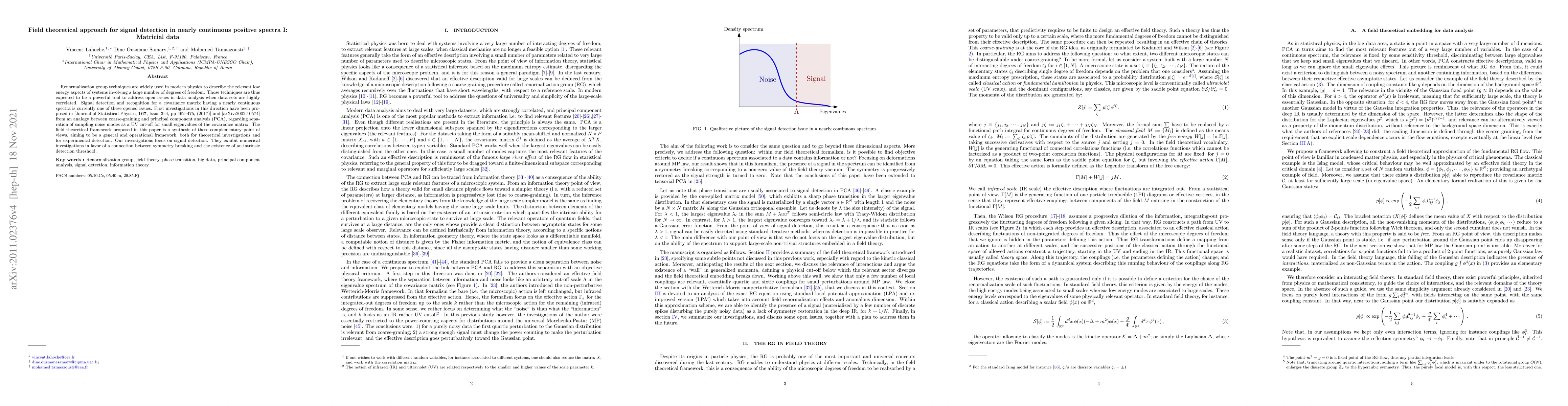 Renormalization group techniques are widely used in modern physics to describe the low energy relevant aspects of systems involving a large number of degrees of freedom. Those techniques are thus expected to be a powerful tool to address open issues in data analysis when data sets are very larges. Signal detection and recognition for covariance matrix having a nearly continuous spectra is currently one of these opened issues. First investigations in this direction has been proposed in [Journal of Statistical Physics, 167, Issue 3-4, pp 462-475, (2017)] and [arXiv:2002.10574], from an analogy between coarse-graining and principal component analysis (PCA), regarding separation of sampling noise modes as a UV cut-off for small eigenvalues of the covariance matrix. The field theoretical framework proposed in this paper is a synthesis of these complementary point of views, aiming to be a general and operational framework, both for theoretical investigations and for experimental detection. Our investigations focus on signal detection, and exhibit experimental evidences in favor of a connection between symmetry breaking and the existence of an intrinsic detection threshold.