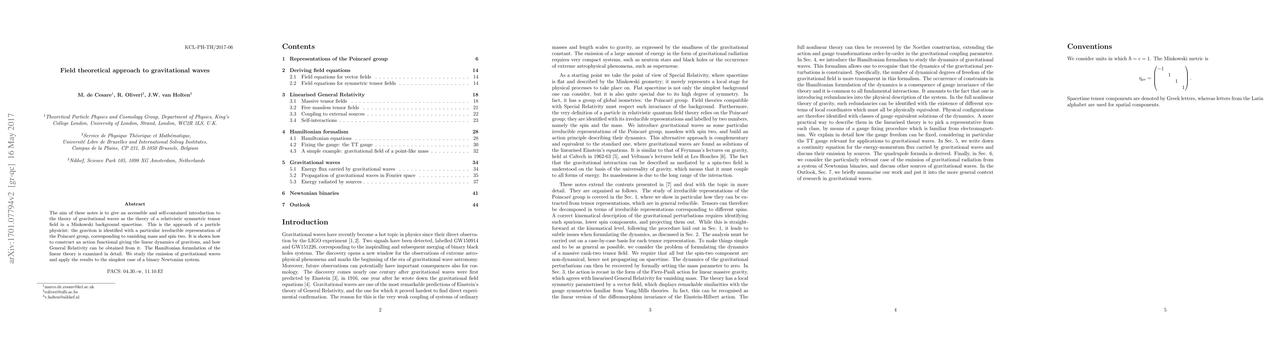 The aim of these notes is to give an accessible and self-contained introduction to the theory of gravitational waves as the theory of a relativistic symmetric tensor field in a Minkowski background spacetime. This is the approach of a particle physicist: the graviton is identified with a particular irreducible representation of the Poincar\'e group, corresponding to vanishing mass and spin two. It is shown how to construct an action functional giving the linear dynamics of gravitons, and how General Relativity can be obtained from it. The Hamiltonian formulation of the linear theory is examined in detail. We study the emission of gravitational waves and apply the results to the simplest case of a binary Newtonian system.