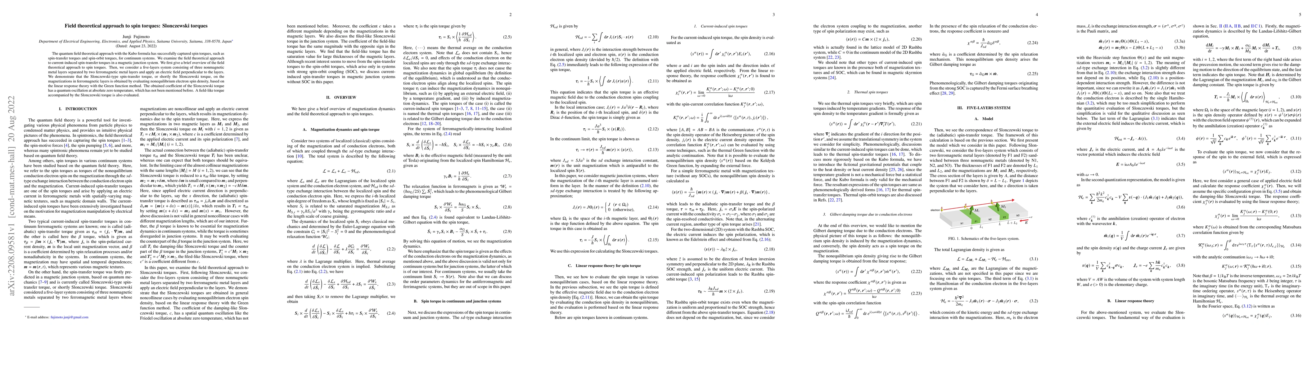 This paper employs a quantum field theoretical approach to derive spin torques, specifically the Slonczewski torque, in a magnetic junction system using the Kubo formula and linear response theory. It reveals a new quantum oscillation in the Slonczewski torque coefficient at absolute zero temperature and also evaluates a field-like torque.