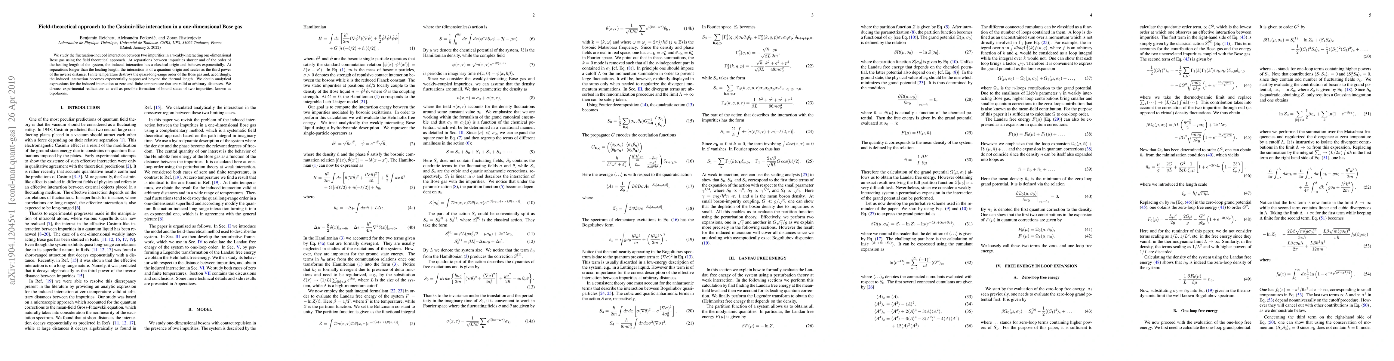 This paper investigates the Casimir-like interaction between two impurities in a one-dimensional Bose gas using a field theoretical approach, revealing classical exponential behavior at short separations and quantum-origin scaling at longer distances. Finite temperature suppresses the interaction, and analytical expressions for the interaction at various temperatures are provided.