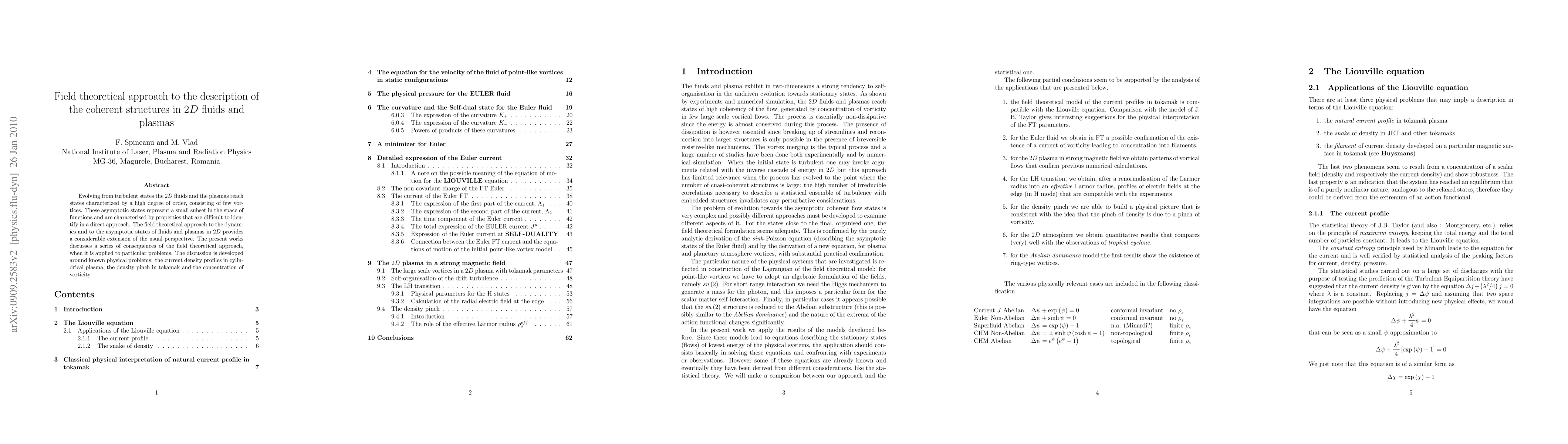 Evolving from turbulent states the 2D fluids and the plasmas reach states characterized by a high degree of order, consisting of few vortices. These asymptotic states represent a small subset in the space of functions and are characterised by properties that are difficult to identify in a direct approach. The field theoretical approach to the dynamics and to the asymptotic states of fluids and plasmas in 2D provides a considerable extension of the usual perspective. The present works discusses a series of consequences of the field theoretical approach, when it is applied to particular problems. The discussion is developed around known physical problems: the current density profiles in cylindrical plasma, the density pinch in tokamak and the concentration of vorticity.