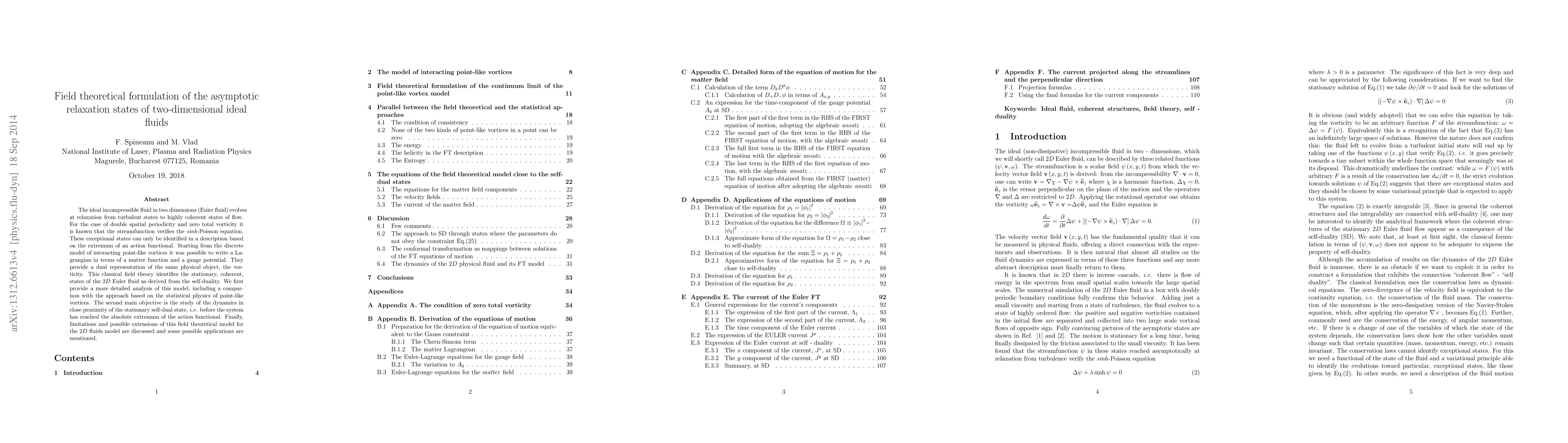 The ideal incompressible fluid in two dimensions (Euler fluid) evolves at relaxation from turbulent states to highly coherent states of flow. For the case of double spatial periodicity and zero total vorticity it is known that the streamfunction verifies the \emph{sinh}-Poisson equation. These exceptional states can only be identified in a description based on the extremum of an action functional. Starting from the discrete model of interacting point-like vortices it was possible to write a Lagrangian in terms of a matter function and a gauge potential. They provide a dual representation of the same physical object, the vorticity. This classical field theory identifies the stationary, coherent, states of the $2D$ Euler fluid as derived from the self-duality. We first provide a more detailed analysis of this model, including a comparison with the approach based on the statistical physics of point-like vortices. The second main objective is the study of the dynamics in close proximity of the stationary self-dual state, \emph{i.e.} before the system has reached the absolute extremum of the action functional. Finally, limitations and possible extensions of this field theoretical model for the $2D$ fluids model are discussed and some possible applications are mentioned.