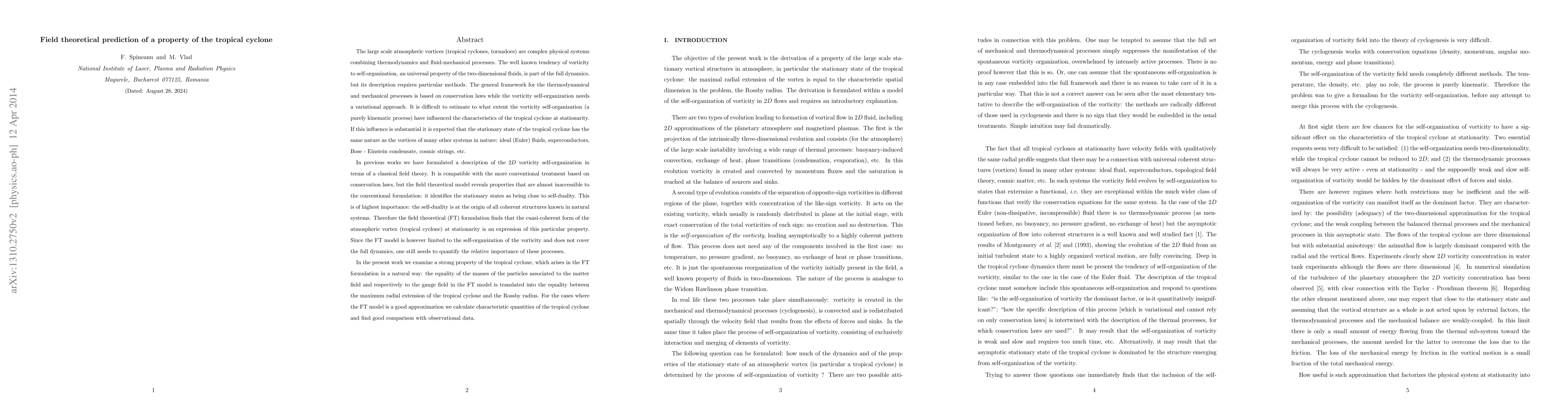 This paper uses field theory to predict a unique property of tropical cyclones, showing that the maximum radial extension of the cyclone equals the Rossby radius. The study finds good agreement between the theoretical predictions and observational data, suggesting the self-organization of vorticity significantly influences cyclone characteristics.