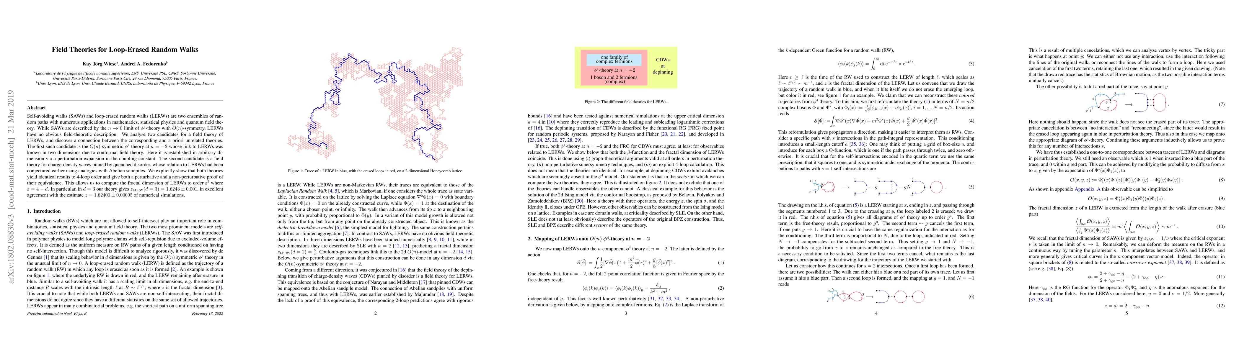 This paper explores two potential field theories for loop-erased random walks (LERWs), demonstrating their equivalence through both perturbative and non-perturbative methods. It establishes the connection between LERWs and the $O(n)$-symmetric $\phi^4$ theory at $n=-2$ and a field theory for charge-density waves, yielding the fractal dimension of LERWs in three dimensions.