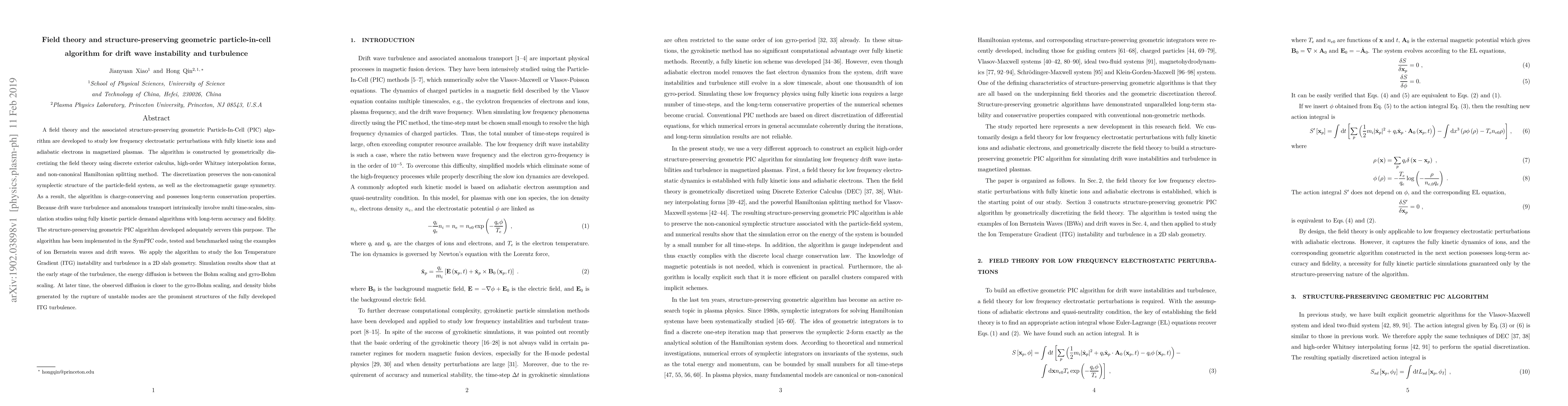 A field theory and the associated structure-preserving geometric Particle-In-Cell (PIC) algorithm are developed to study low frequency electrostatic perturbations with fully kinetic ions and adiabatic electrons in magnetized plasmas. The algorithm is constructed by geometrically discretizing the field theory using discrete exterior calculus, high-order Whitney interpolation forms, and non-canonical Hamiltonian splitting method. The discretization preserves the non-canonical symplectic structure of the particle-field system, as well as the electromagnetic gauge symmetry. As a result, the algorithm is charge-conserving and possesses long-term conservation properties. Because drift wave turbulence and anomalous transport intrinsically involve multi time-scales, simulation studies using fully kinetic particle demand algorithms with long-term accuracy and fidelity. The structure-preserving geometric PIC algorithm developed adequately servers this purpose. The algorithm has been implemented in the \textsl{SymPIC} code, tested and benchmarked using the examples of ion Bernstein waves and drift waves. We apply the algorithm to study the Ion Temperature Gradient (ITG) instability and turbulence in a 2D slab geometry. Simulation results show that at the early stage of the turbulence, the energy diffusion is between the Bohm scaling and gyro-Bohm scaling. At later time, the observed diffusion is closer to the gyro-Bohm scaling, and density blobs generated by the rupture of unstable modes are the prominent structures of the fully developed ITG turbulence.