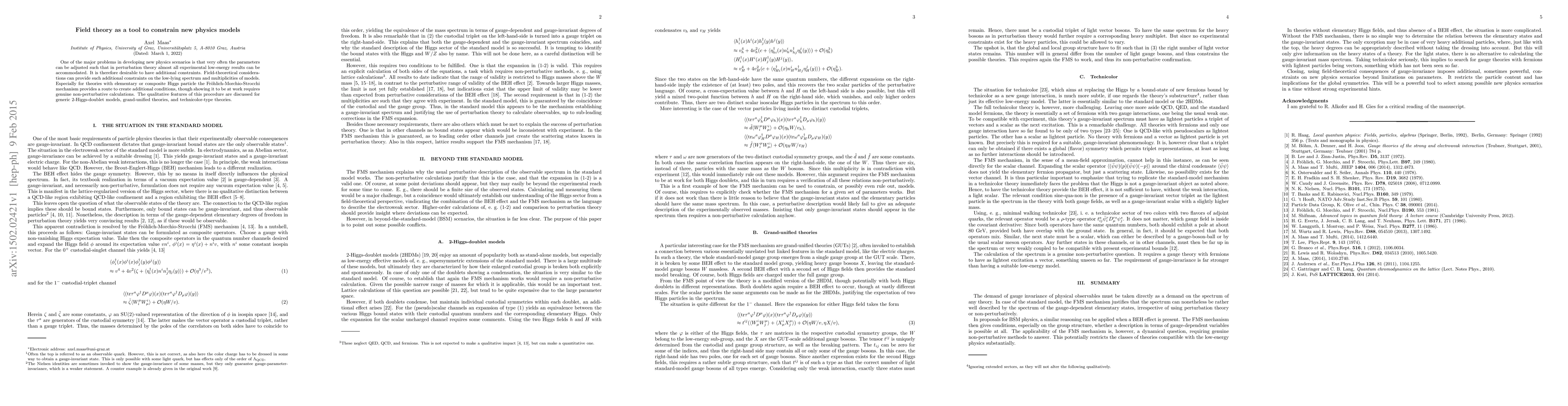 This paper uses field theory to constrain new physics models, particularly those with elementary or composite Higgs particles, by providing additional constraints on low-energy results. It discusses the Fr"ohlich-Morchio-Strocchi mechanism as a route to create conditions for these theories.