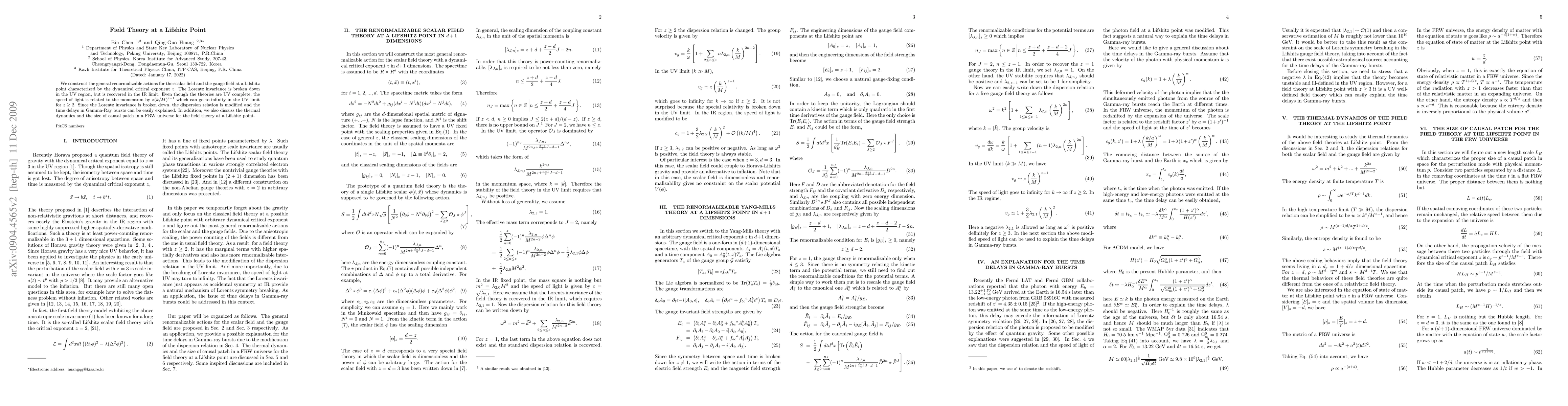 This paper constructs renormalizable actions for scalar and gauge fields at a Lifshitz point, where Lorentz invariance is broken in the UV but restored in the IR. The modified dispersion relation allows for explanations of time delays in Gamma-Ray bursts, and it also discusses thermal dynamics and causal patch size in a FRW universe.