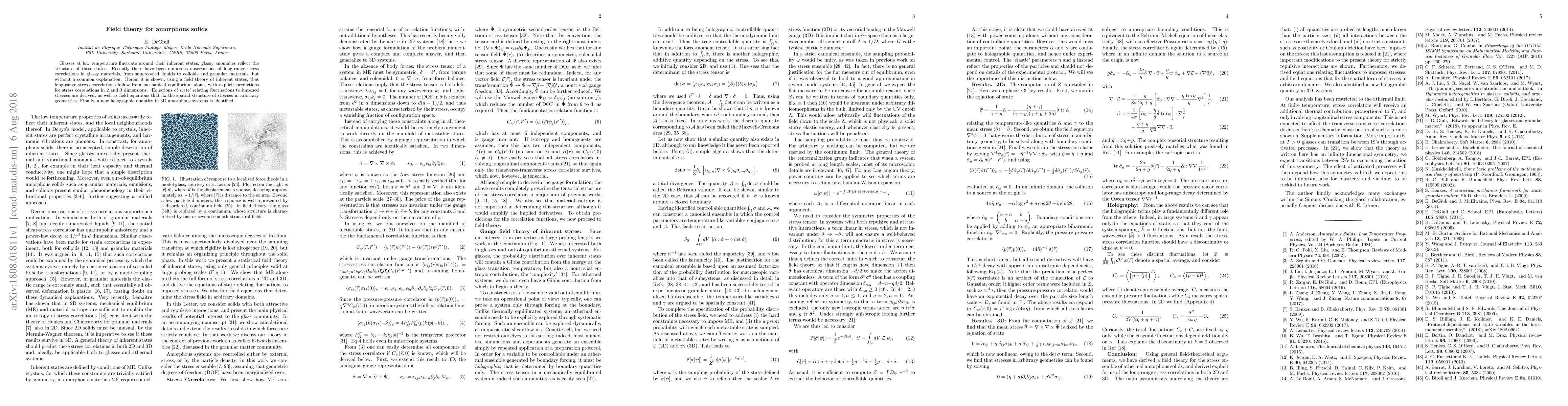Glasses at low temperature fluctuate around their inherent states; glassy anomalies reflect the structure of these states. Recently there have been numerous observations of long-range stress correlations in glassy materials, from supercooled liquids to colloids and granular materials, but without a common explanation. Herein it is shown, using a field theory of inherent states, that long-range stress correlations follow from mechanical equilibrium alone, with explicit predictions for stress correlations in 2 and 3 dimensions. `Equations of state' relating fluctuations to imposed stresses are derived, as well as field equations that fix the spatial structure of stresses in arbitrary geometries. Finally, a new holographic quantity in 3D amorphous systems is identified.