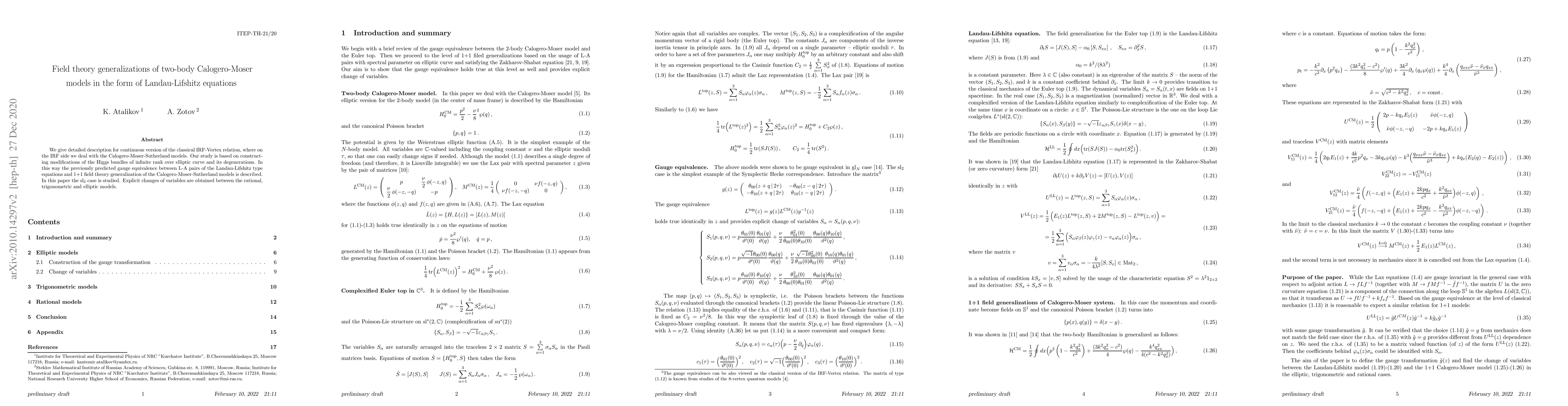 This paper explores the continuous version of the classical IRF-Vertex relation, focusing on Calogero-Moser-Sutherland models. It constructs modifications of Higgs bundles over elliptic curves to demonstrate gauge equivalence between Landau-Lifshitz equations and the field theory generalization of the Calogero-Moser-Sutherland models, specifically in the ${\rm sl}_2$ case.