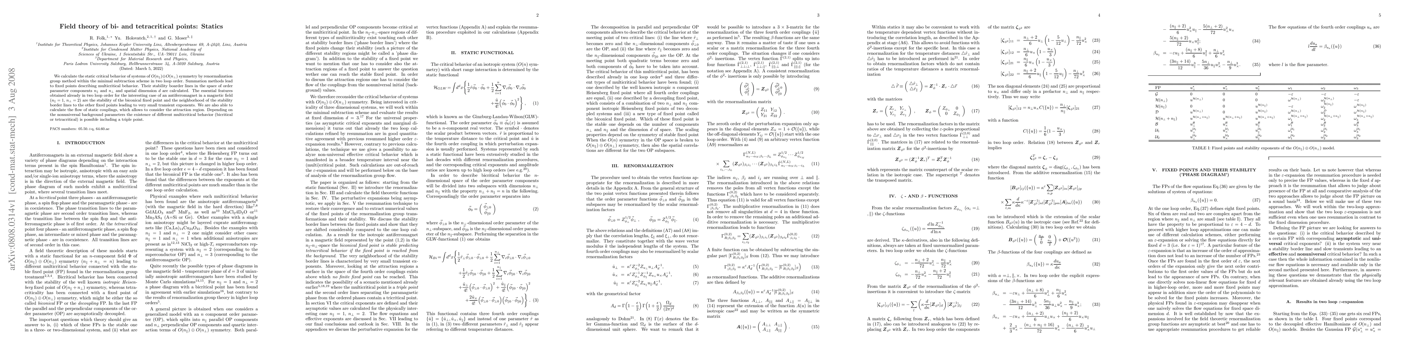 We calculate the static critical behavior of systems of $O(n_\|)\oplus O(n_\perp)$ symmetry by renormalization group method within the minimal subtraction scheme in two loop order. Summation methods lead to fixed points describing multicritical behavior. Their stability boarder lines in the space of order parameter components $n_\|$ and $n_\perp$ and spatial dimension $d$ are calculated. The essential features obtained already in two loop order for the interesting case of an antiferromagnet in a magnetic field ($n_\|=1$, $n_\perp=2$) are the stability of the biconical fixed point and the neighborhood of the stability border lines to the other fixed points leading to very small transient exponents. We are also able to calculate the flow of static couplings, which allows to consider the attraction region. Depending on the nonuniversal background parameters the existence of different multicritical behavior (bicritical or tetracritical) is possible including a triple point.
