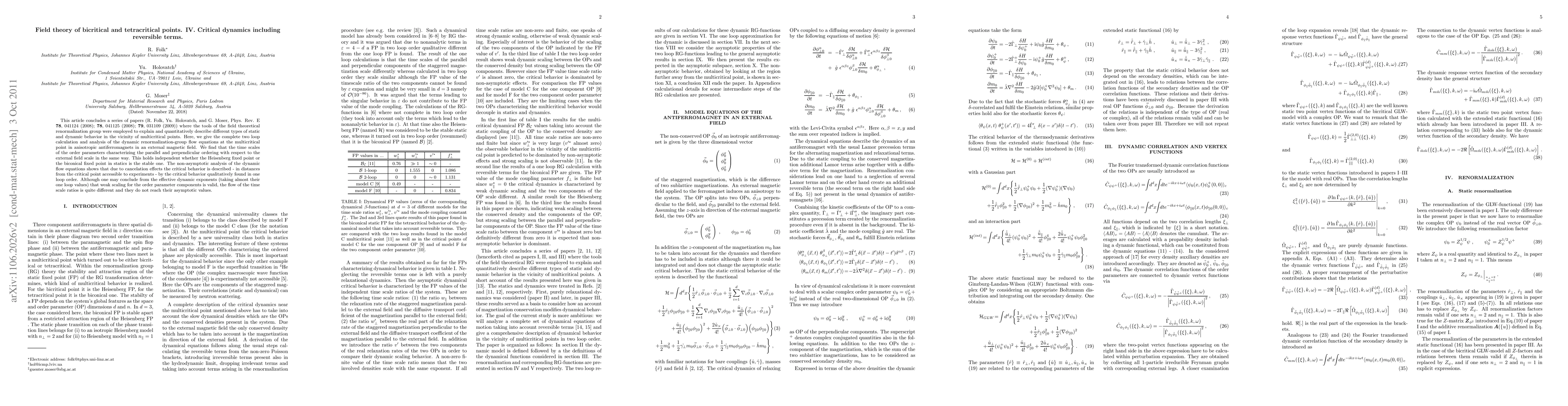 This article concludes a series of papers (R. Folk, Yu. Holovatch, and G. Moser, Phys. Rev. E 78, 041124 (2008); 78, 041125 (2008); 79, 031109 (2009)) where the tools of the field theoretical renormalization group were employed to explain and quantitatively describe different types of static and dynamic behavior in the vicinity of multicritical points. Here, we give the complete two loop calculation and analysis of the dynamic renormalization-group flow equations at the multicritical point in anisotropic antiferromagnets in an external magnetic field. We find that the time scales of the order parameters characterizing the parallel and perpendicular ordering with respect to the external field scale in the same way. This holds independent whether the Heisenberg fixed point or the biconical fixed point in statics is the stable one. The non-asymptotic analysis of the dynamic flow equations shows that due to cancelation effects the critical behavior is described - in distances from the critical point accessible to experiments - by the critical behavior qualitatively found in one loop order. Although one may conclude from the effective dynamic exponents (taking almost their one loop values) that weak scaling for the order parameter components is valid, the flow of the time scale ratios is quite different and they do not reach their asymptotic values.