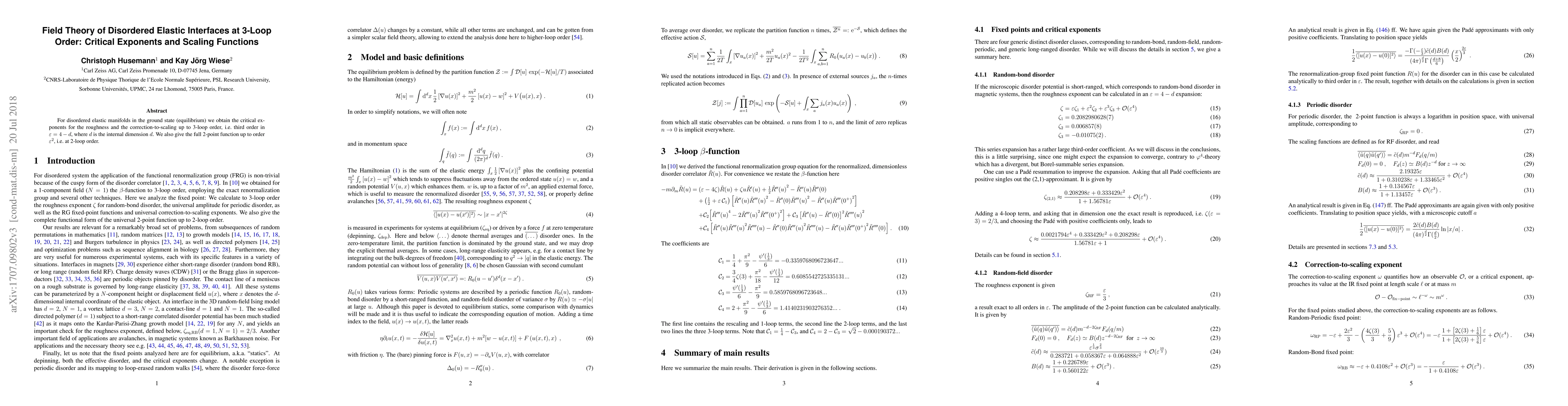 For disordered elastic manifolds in the ground state (equilibrium) we obtain the critical exponents for the roughness and the correction-to-scaling up to 3-loop order, i.e. third order in $\epsilon=4-d$, where $d$ is the internal dimension $d$. We also give the full 2-point function up to order $\epsilon^{2}$, i.e. at 2-loop order.