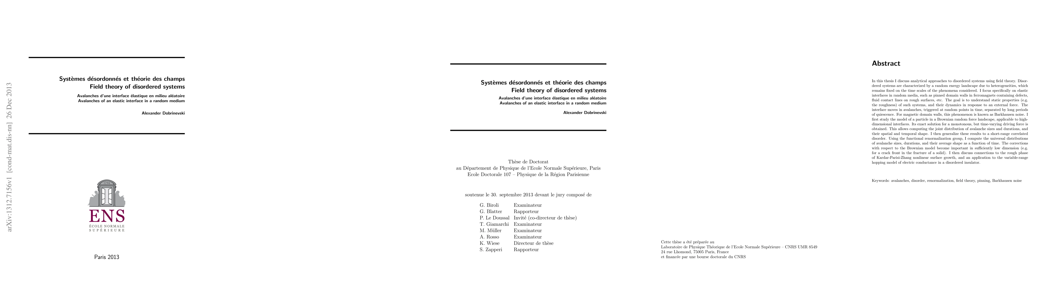 In this thesis I discuss analytical approaches to disordered systems using field theory. Disordered systems are characterized by a random energy landscape due to heterogeneities, which remains fixed on the time scales of the phenomena considered. I focus specifically on elastic interfaces in random media, such as pinned domain walls in ferromagnets containing defects, fluid contact lines on rough surfaces, etc. The goal is to understand static properties (e.g. the roughness) of such systems, and their dynamics in response to an external force. The interface moves in avalanches, triggered at random points in time, separated by long periods of quiescence. For magnetic domain walls, this phenomenon is known as Barkhausen noise. I first study the model of a particle in a Brownian random force landscape, applicable to high-dimensional interfaces. Its exact solution for a monotonous, but time-varying driving force is obtained. This allows computing the joint distribution of avalanche sizes and durations, and their spatial and temporal shape. I then generalize these results to a short-range correlated disorder. Using the functional renormalization group, I compute the universal distributions of avalanche sizes, durations, and their average shape as a function of time. The corrections with respect to the Brownian model become important in sufficiently low dimension (e.g. for a crack front in the fracture of a solid). I then discuss connections to the rough phase of Kardar-Parisi-Zhang nonlinear surface growth, and an application to the variable-range hopping model of electric conductance in a disordered insulator.