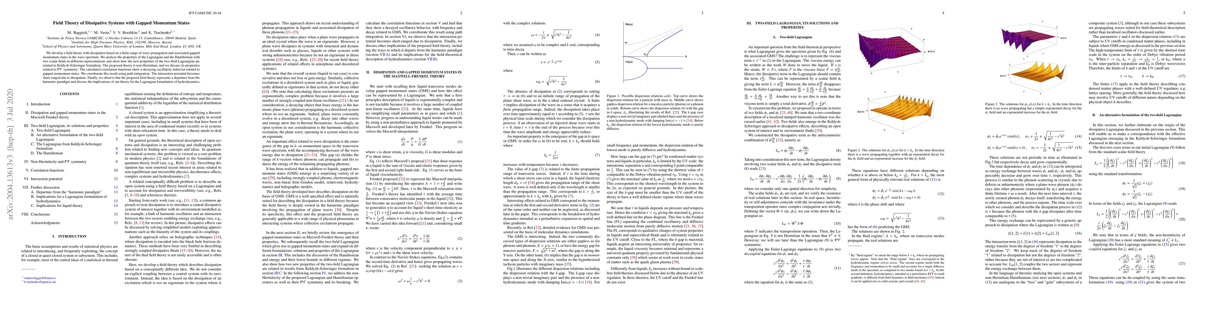 We develop a field theory with dissipation based on a finite range of wave propagation and associated gapped momentum states in the wave spectrum. We analyze the properties of the Lagrangian and the Hamiltonian with two scalar fields in different representations and show how the new properties of the two-field Lagrangian are related to Keldysh-Schwinger formalism. The proposed theory is non-Hermitian, and we discuss its properties related to $\mathcal{PT}$ symmetry. The calculated correlation functions show a decaying oscillatory behavior related to gapped momentum states. We corroborate this result using path integration. The interaction potential becomes short-ranged due to dissipation. Finally, we observe that the proposed field theory represents a departure from the harmonic paradigm and discuss the implications of our theory for the Lagrangian formulation of hydrodynamics.