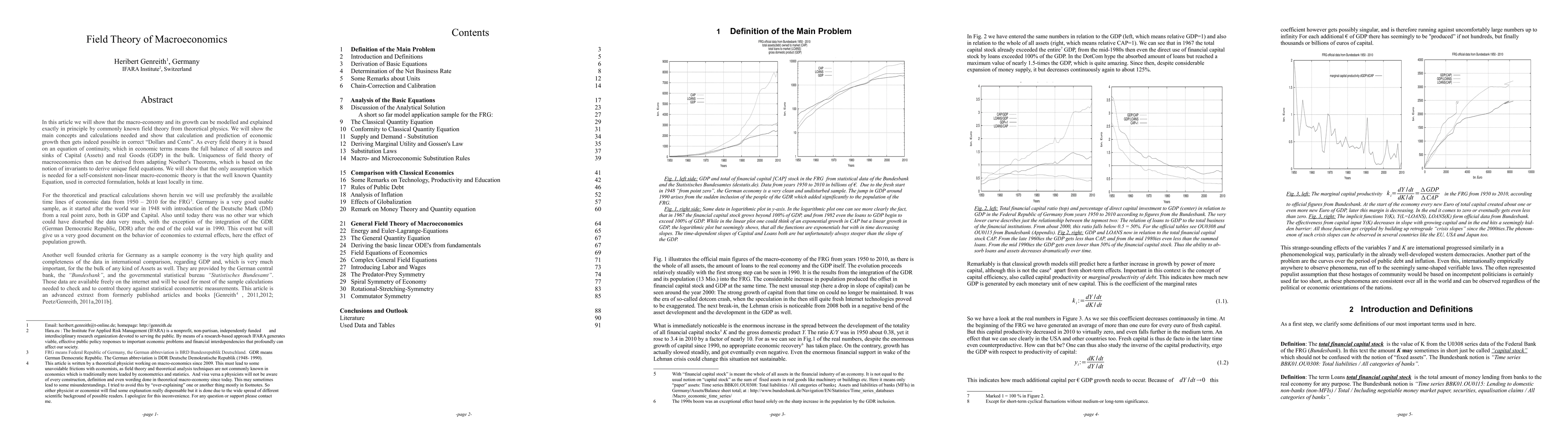 In this article we will show that the Macro-Economy and its growth can be modelled and explained exactly in principle by commonly known Field Theory from theoretical physics. We will show the main concepts and calculations needed and show that calculation and prediction of economic growth then gets indeed possible in Dollars and Cents. As every field theory it is based on an equation of continuity, which in economic terms means the full balance of all sources and sinks of Capital (Assets) and real Goods (GDP) in the bulk. Uniqueness of field theory of macroeconomics then can be derived from adapting Noether's Theorems, which is based on the notion of invariants to derive unique field equations. We will show that the only assumption which is needed for a self-consistent non-linear macro-economic theory is that the well known Quantity Equation, used in corrected formulation, holds at least locally in time.