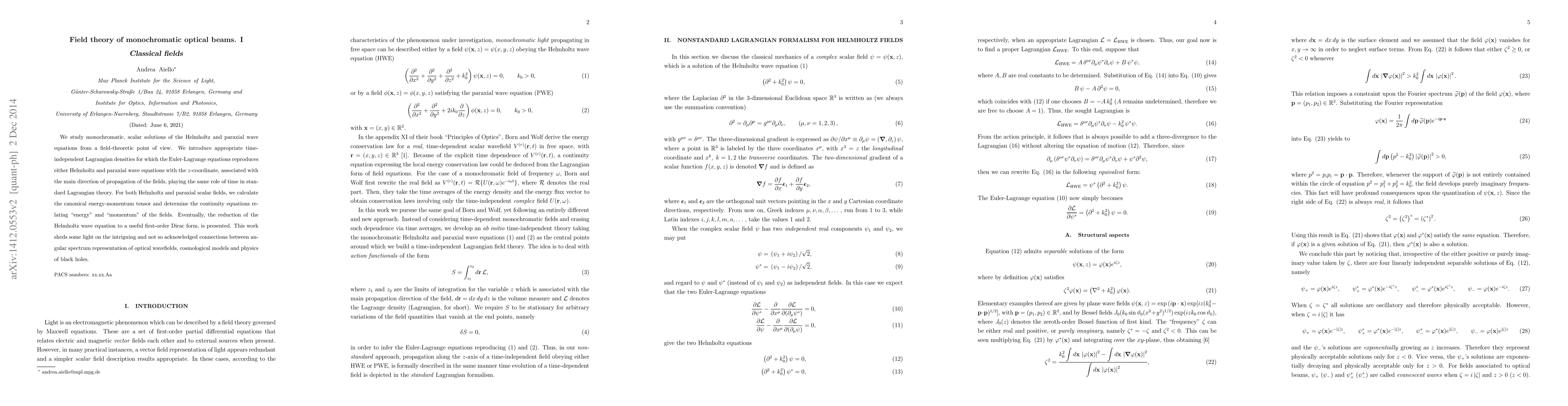 This paper explores monochromatic optical beams through the lens of field theory, deriving Lagrangian densities for Helmholtz and paraxial wave equations. It calculates the canonical energy-momentum tensors and continuity equations for these fields, revealing connections to angular spectrum representation, cosmology, and black hole physics.