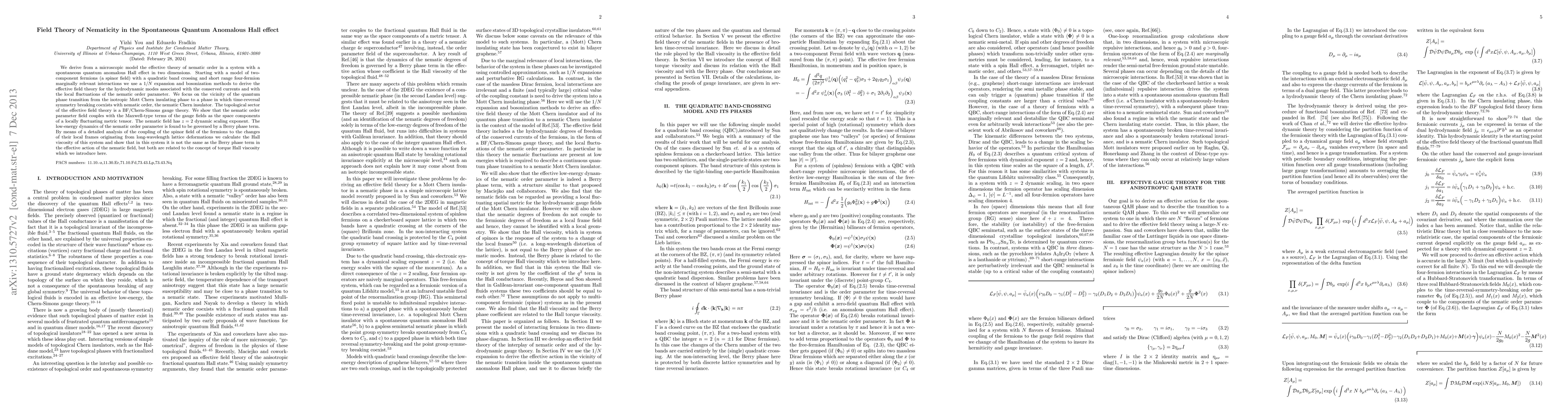 This paper develops an effective field theory for nematic order in a two-dimensional system with a spontaneous quantum anomalous Hall effect, derived from a microscopic model of fermions. It shows the coupling of the nematic order parameter to gauge fields and introduces the concept of torque Hall viscosity.