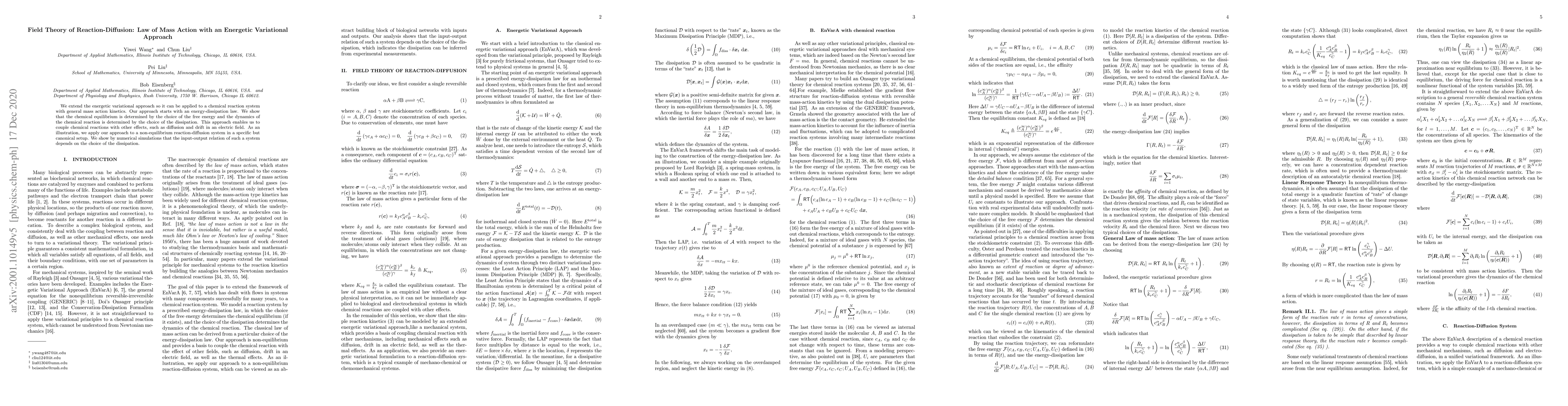 We extend the energetic variational approach so it can be applied to a chemical reaction system with general mass action kinetics. Our approach starts with an energy-dissipation law. We show that the chemical equilibrium is determined by the choice of the free energy and the dynamics of the chemical reaction is determined by the choice of the dissipation. This approach enables us to couple chemical reactions with other effects, such as diffusion and drift in an electric field. As an illustration, we apply our approach to a non-equilibrium reaction-diffusion system in a specific but canonical set-up. We show by numerical simulation that the input-output relation of such a system depends on the choice of the dissipation.