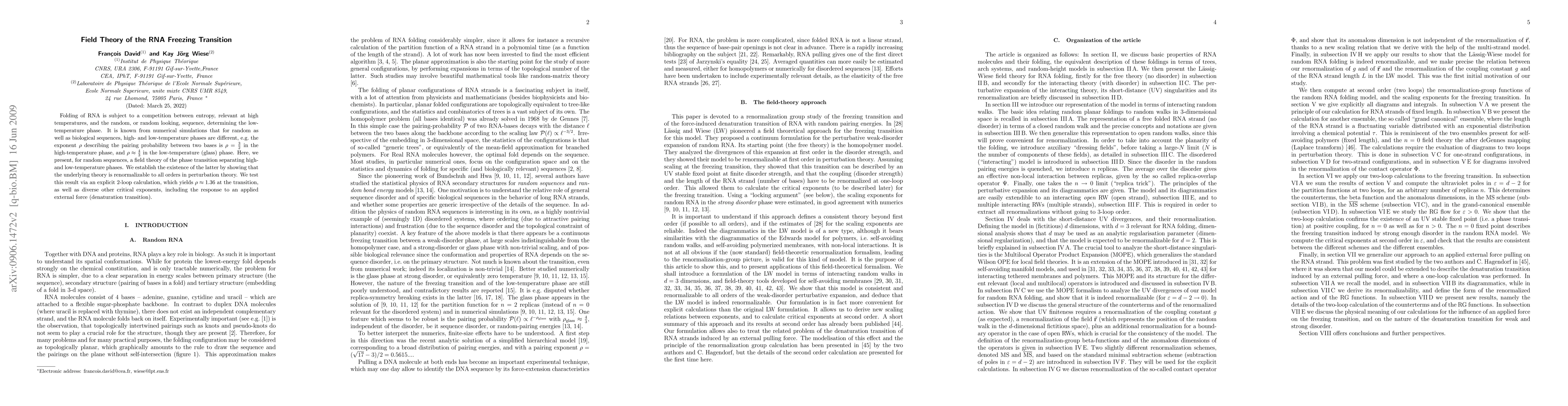 This research presents a field theory for the RNA freezing transition in random sequences, proving renormalizability to all orders in perturbation theory. It validates the theory via a 2-loop calculation, finding critical exponent rho ≈ 1.36 at the transition, along with other exponents, including response to external force.
