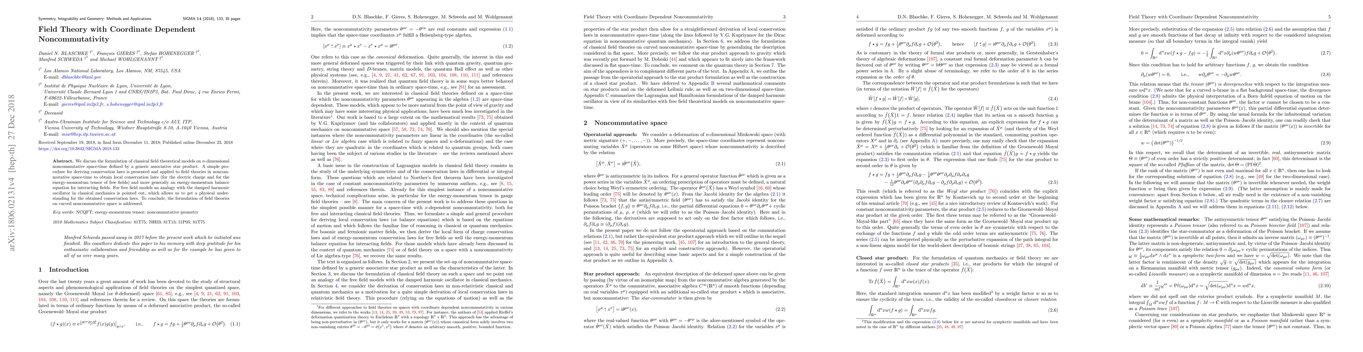 We discuss the formulation of classical field theoretical models on $n$-dimensional noncommutative space-time defined by a generic associative star product. A simple procedure for deriving conservation laws is presented and applied to field theories in noncommutative space-time to obtain local conservation laws (for the electric charge and for the energy-momentum tensor of free fields) and more generally an energy-momentum balance equation for interacting fields. For free field models an analogy with the damped harmonic oscillator in classical mechanics is pointed out, which allows us to get a physical understanding for the obtained conservation laws. To conclude, the formulation of field theories on curved noncommutative space is addressed.