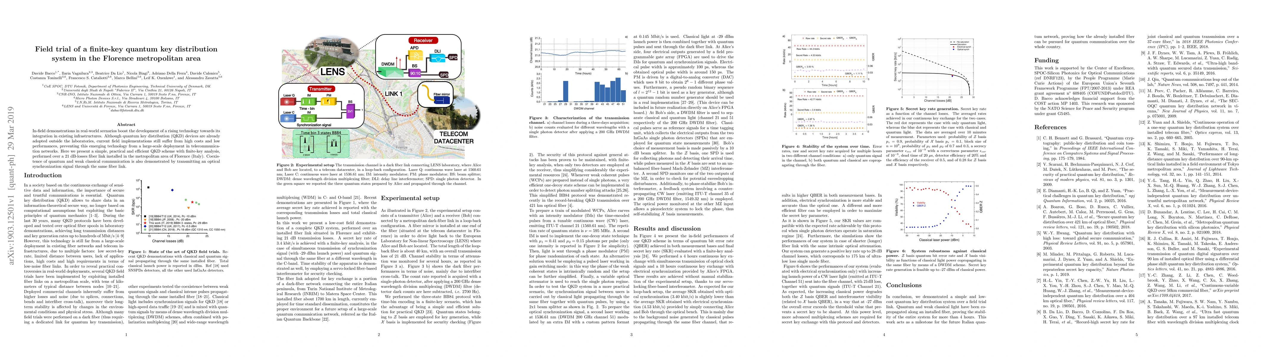 In-field demonstrations in real-world scenarios boost the development of a rising technology towards its integration in existing infrastructures. Although quantum key distribution (QKD) devices are already adopted outside the laboratories, current field implementations still suffer from high costs and low performances, preventing this emerging technology from a large-scale deployment in telecommunication networks. Here we present a simple, practical and efficient QKD scheme with finite-key analysis, performed over a 21 dB-losses fiber link installed in the metropolitan area of Florence (Italy). Coexistence of quantum and weak classical communication is also demonstrated by transmitting an optical synchronization signal through the same fiber link.