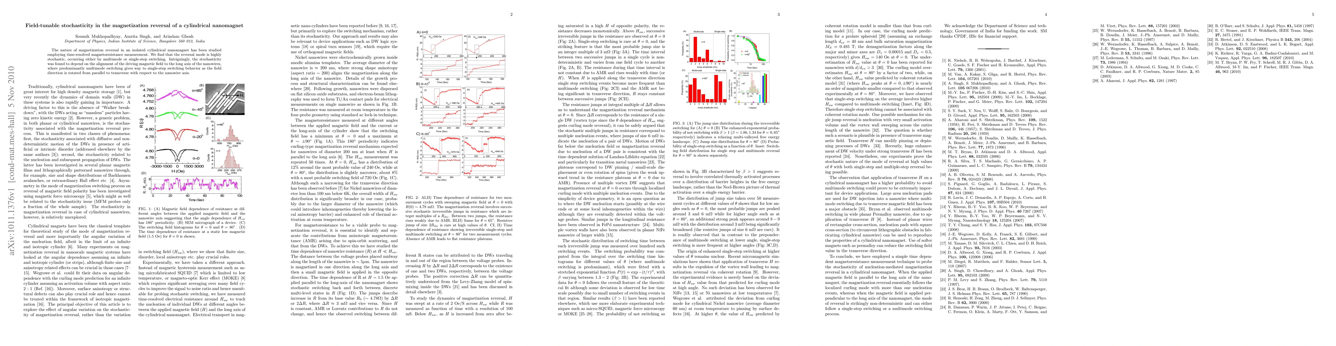 This study reveals that magnetization reversal in cylindrical nanomagnets is stochastic, switching either via multimode or single-step processes. The reversal mode's stochasticity is tunable by adjusting the alignment of the driving magnetic field to the nanowire's long axis, transitioning from multimode to single-step switching as the field direction changes from parallel to transverse.