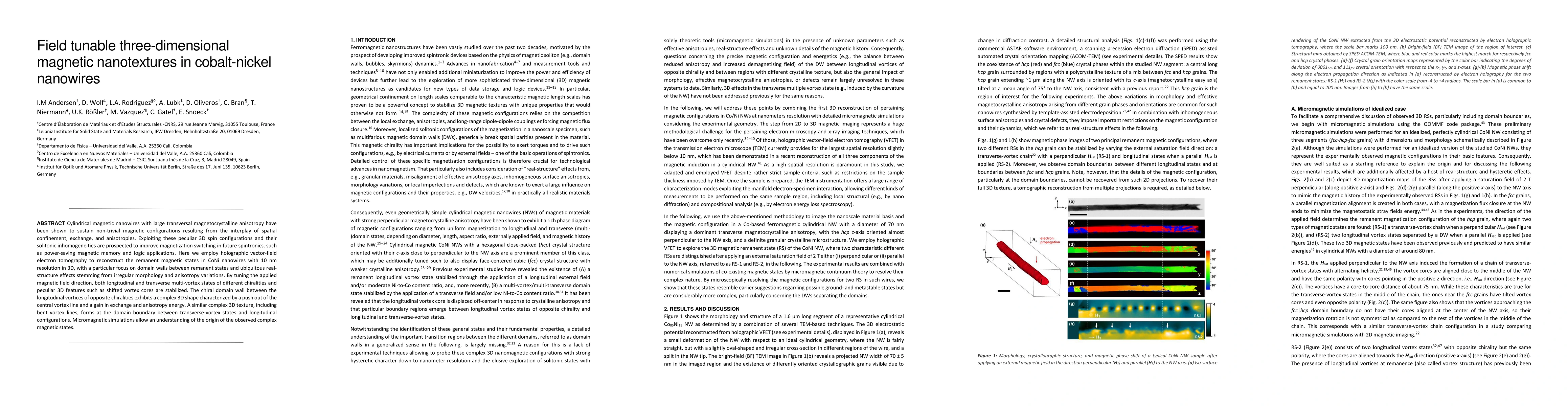 This paper investigates the magnetic nanotextures in cobalt-nickel nanowires using advanced electron tomography, revealing the stabilization of various multi-vortex states under different magnetic field directions. The study highlights the potential of these complex 3D magnetic configurations to enhance magnetization switching in future spintronic devices.