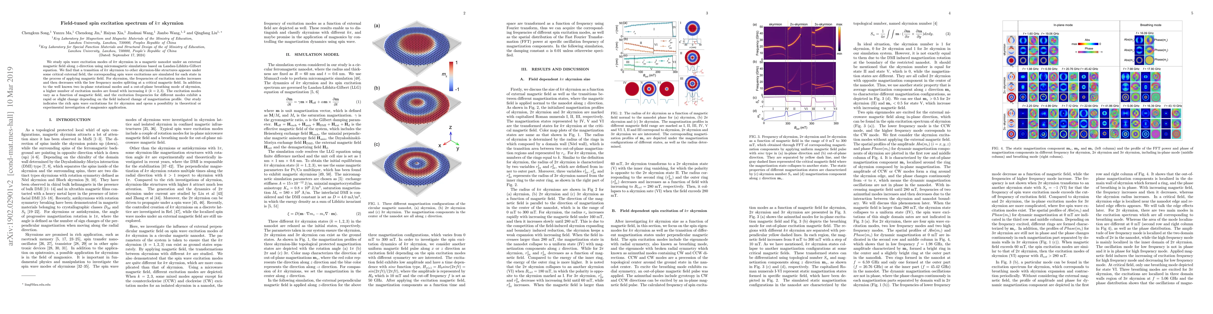 This study investigates spin-wave excitations in $k\pi$ skyrmions in magnetic nanodots under varying external magnetic fields, revealing transitions to other skyrmion-like structures and a complex spectrum of excitation modes that change with the magnetic field. The findings suggest potential for advanced magnonics applications.
