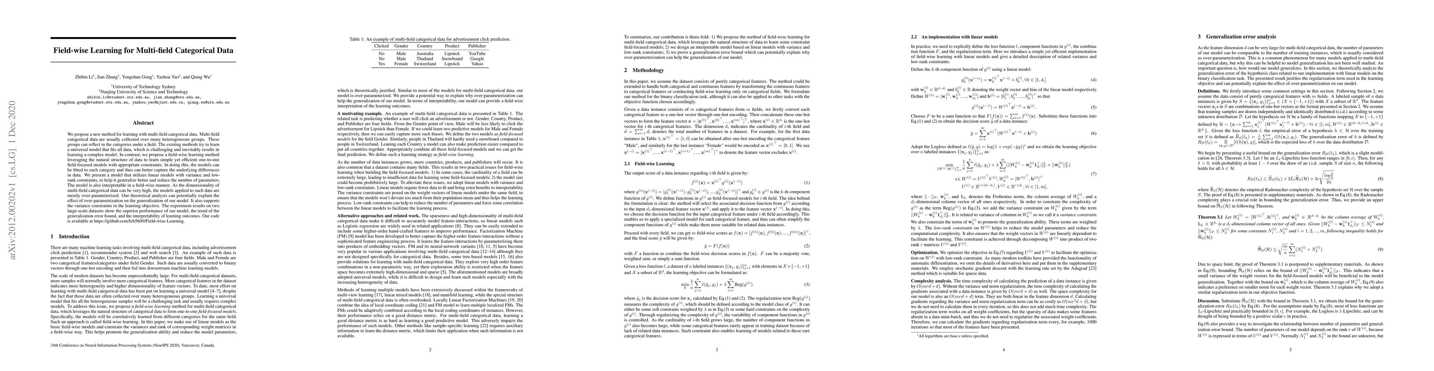 We propose a new method for learning with multi-field categorical data. Multi-field categorical data are usually collected over many heterogeneous groups. These groups can reflect in the categories under a field. The existing methods try to learn a universal model that fits all data, which is challenging and inevitably results in learning a complex model. In contrast, we propose a field-wise learning method leveraging the natural structure of data to learn simple yet efficient one-to-one field-focused models with appropriate constraints. In doing this, the models can be fitted to each category and thus can better capture the underlying differences in data. We present a model that utilizes linear models with variance and low-rank constraints, to help it generalize better and reduce the number of parameters. The model is also interpretable in a field-wise manner. As the dimensionality of multi-field categorical data can be very high, the models applied to such data are mostly over-parameterized. Our theoretical analysis can potentially explain the effect of over-parametrization on the generalization of our model. It also supports the variance constraints in the learning objective. The experiment results on two large-scale datasets show the superior performance of our model, the trend of the generalization error bound, and the interpretability of learning outcomes. Our code is available at https://github.com/lzb5600/Field-wise-Learning.