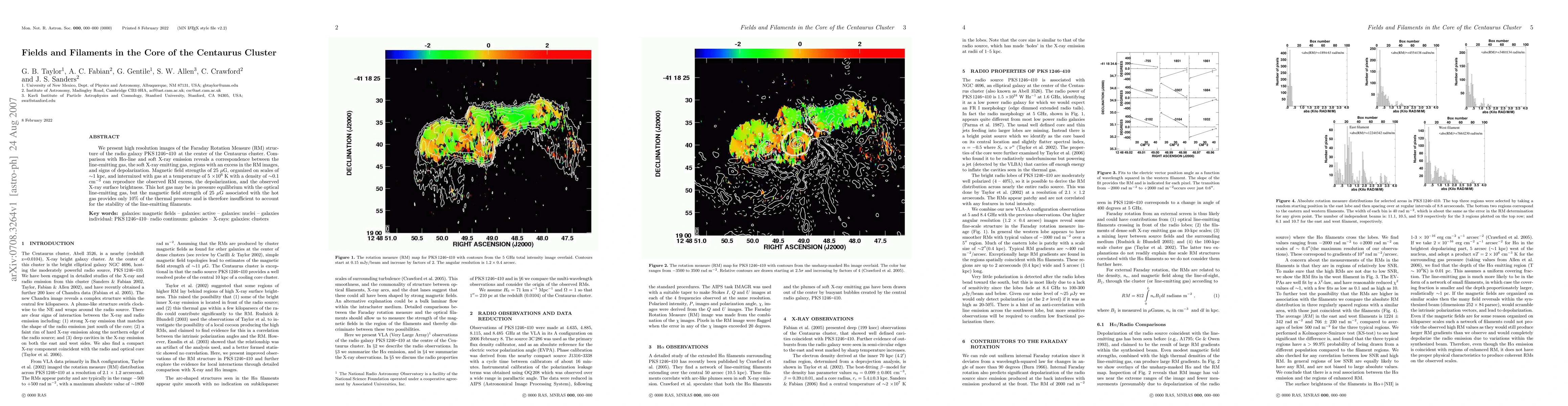 We present high resolution images of the Faraday Rotation Measure (RM) structure of the radio galaxy PKS 1246-410, at the center of the Centaurus cluster. Comparison with Halpha-line and soft X-ray emission reveals a correspondence between the line-emitting gas, the soft X-ray emitting gas, regions with an excess in the RM images, and signs of depolarization. Magnetic field strengths of 25 microG, organized on scales of ~1 kpc, and intermixed with gas at a temperature of 5 x 10^6 K with a density of ~0.1 cm^-3 can reproduce the observed RM excess, the depolarization, and the observed X-ray surface brightness. This hot gas may be in pressure equilibrium with the optical line-emitting gas, but the magnetic field strength of 25 microG associated with the hot gas provides only 10% of the thermal pressure and is therefore insufficient to account for the stability of the line-emitting filaments.