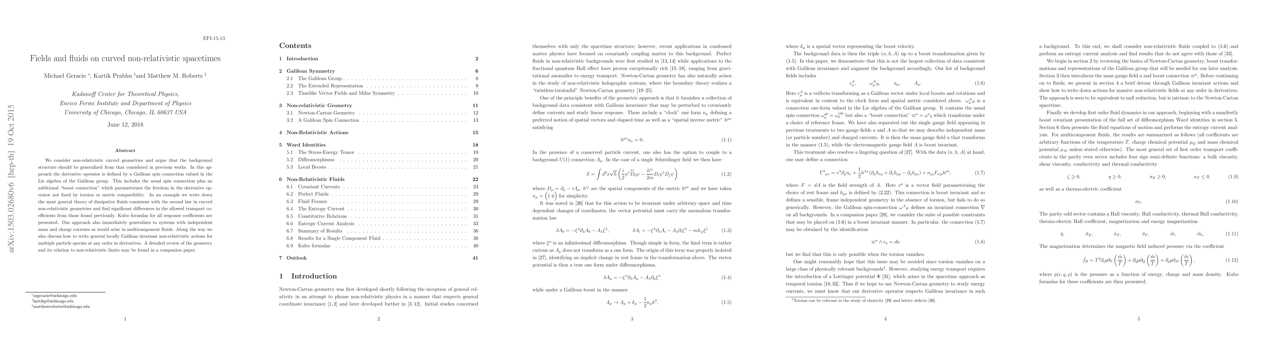 We consider non-relativistic curved geometries and argue that the background structure should be generalized from that considered in previous works. In this approach the derivative operator is defined by a Galilean spin connection valued in the Lie algebra of the Galilean group. This includes the usual spin connection plus an additional "boost connection" which parameterizes the freedom in the derivative operator not fixed by torsion or metric compatibility. As an example we write down the most general theory of dissipative fluids consistent with the second law in curved non-relativistic geometries and find significant differences in the allowed transport coefficients from those found previously. Kubo formulas for all response coefficients are presented. Our approach also immediately generalizes to systems with independent mass and charge currents as would arise in multicomponent fluids. Along the way we also discuss how to write general locally Galilean invariant non-relativistic actions for multiple particle species at any order in derivatives. A detailed review of the geometry and its relation to non-relativistic limits may be found in a companion paper [arXiv:1503.02682].