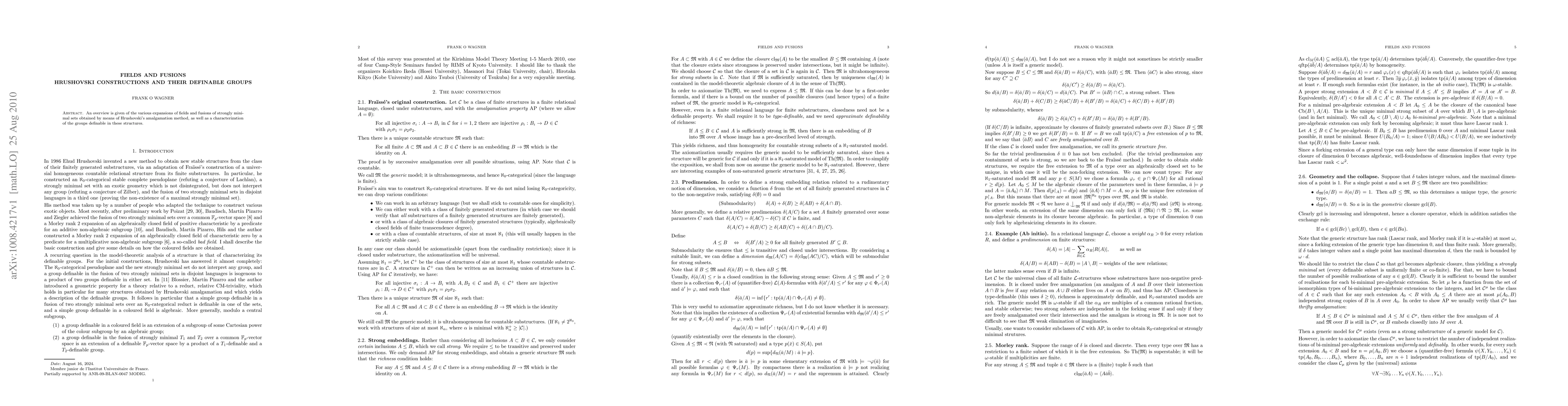 An overview is given of the various expansions of fields and fusions of strongly minimal sets obtained by means of Hrushovski's amalgamation method, as well as a characterization of the groups definable in these structures.