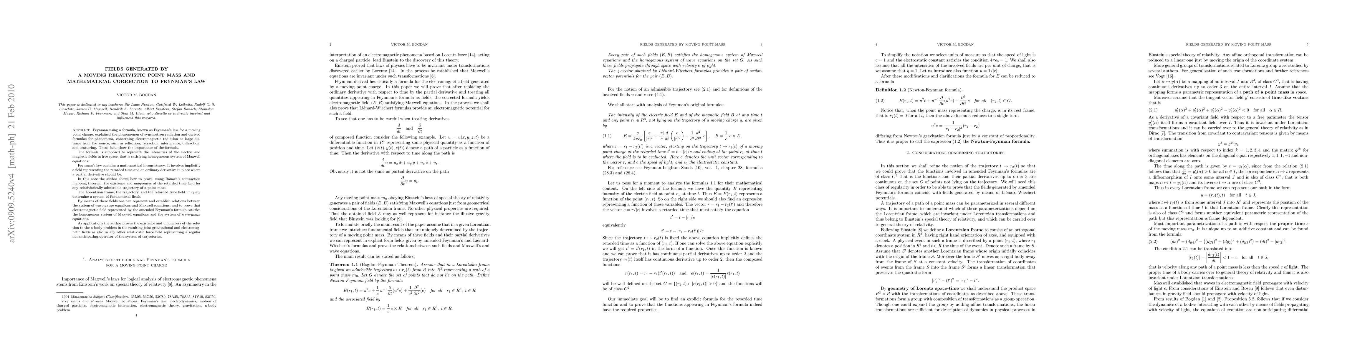This paper analyzes the electromagnetic fields generated by a moving relativistic point mass, correcting Feynman's original formula. It introduces fundamental fields determined by the Lorentzian frame, trajectory, and retarded time, proving their equivalence to Lienard-Wiechert potentials and adherence to Maxwell and wave equations. The Bogdan-Feynman Theorem consolidates these findings and extends to general relativistic n-body problems, employing nonanticipating differential equations and uniformly Lipschitzian operators.