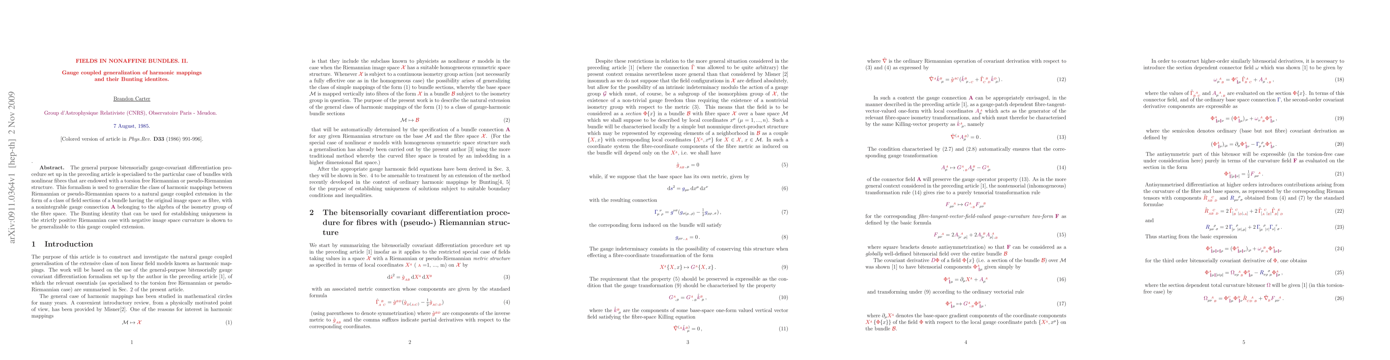 The general purpose bitensorially gauge-covariant differentiation procedure set up in the preceding article is specialised to the particular case of bundles with nonlinear fibres that are endowed with a torsion free Riemannian or pseudo-Riemannian structure. This formalism is used to generalize the class of harmonic mappings between Riemannian or pseudo-Riemannian spaces to a natural gauge coupled extension in the form of a class of field sections of a bundle having the original image space as fibre, with a nonintegrable gauge connection $\Amr$ belonging to the algebra of the isometry group of the fibre space. The Bunting identity that can be used for establishing uniqueness in the strictly positive Riemannian case with negative image space curvature is shown to be generalizable to this gauge coupled extension.