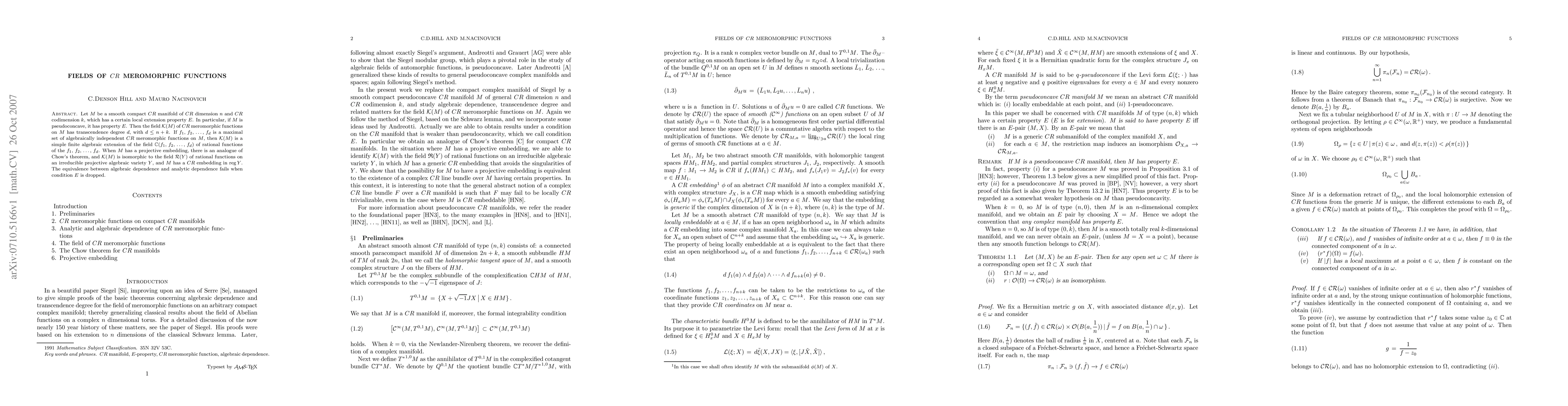 Let $M$ be a smooth compact $CR$ manifold of $CR$ dimension $n$ and $CR$ codimension $k$, which has a certain local extension property $E$. In particular, if $M$ is pseudoconcave, it has property $E$. Then the field $\Cal K(M)$ of $CR$ meromorphic functions on $M$ has transcendence degree $d$, with $d\leq n+k$. If $f_1, f_2, \hdots , f_d$ is a maximal set of algebraically independent $CR$ meromorphic functions on $M$, then $\Cal K(M)$ is a simple finite algebraic extension of the field $\Bbb C(f_1, f_2, \hdots, f_d)$ of rational functions of the $f_1, f_2, \hdots , f_d$. When $M$ has a projective embedding, there is an analogue of Chow's theorem, and $\Cal K(M)$ is isomorphic to the field $\Cal R(Y)$ of rational functions on an irreducible projective algebraic variety $Y$, and $M$ has a $CR$ embedding in $\roman{reg} Y$. The equivalence between algebraic dependence and analytic dependence fails when condition $E$ is dropped.