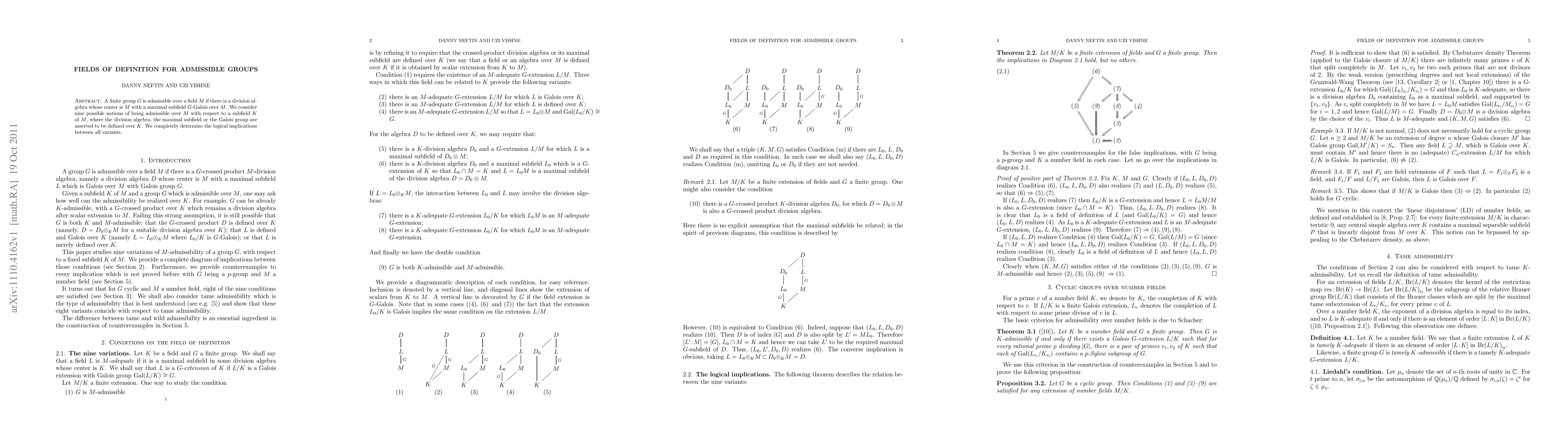 A finite group G is admissible over a field M if there is a division algebra whose center is M with a maximal subfield G-Galois over M. We consider nine possible notions of being admissible over M with respect to a subfield K of M, where the division algebra, the maximal subfield or the Galois group are asserted to be defined over K. We completely determine the logical implications between all variants.