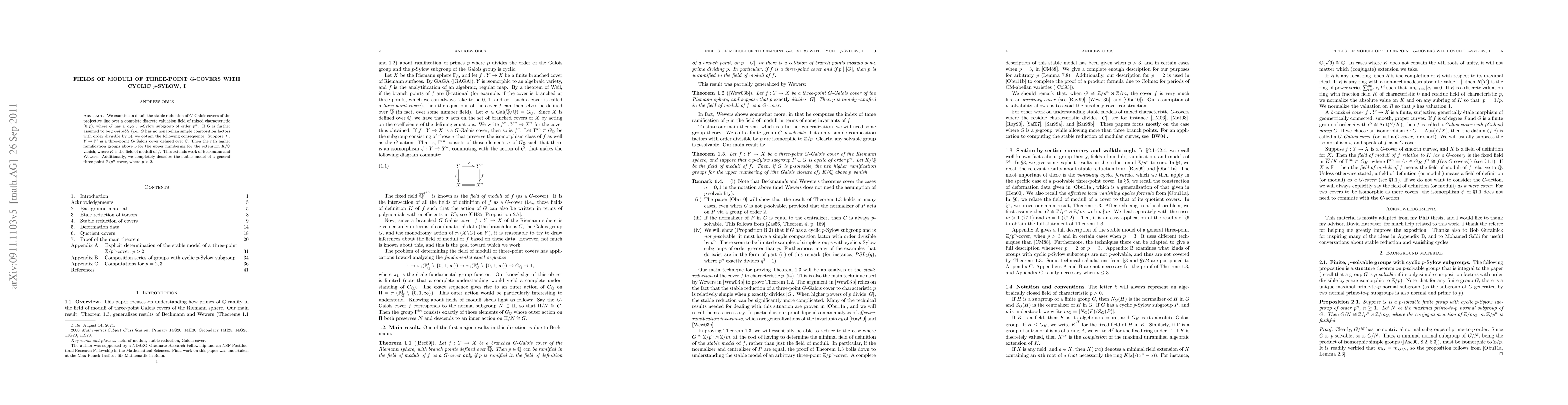 We examine in detail the stable reduction of Galois covers of the projective line over a complete discrete valuation field of mixed characteristic (0, p), where G has a cyclic p-Sylow subgroup of order p^n. If G is further assumed to be p-solvable (i.e., G has no nonabelian simple composition factors with order divisible by p), we obtain the following consequence: Suppose f: Y --> P^1 is a three-point G-Galois cover defined over the complex numbers. Then the nth higher ramification groups above p for the upper numbering of the (Galois closure of the) extension K/Q vanish, where K is the field of moduli of f. This extends work of Beckmann and Wewers. Additionally, we completely describe the stable model of a general three-point Z/p^n-cover, where p > 2.