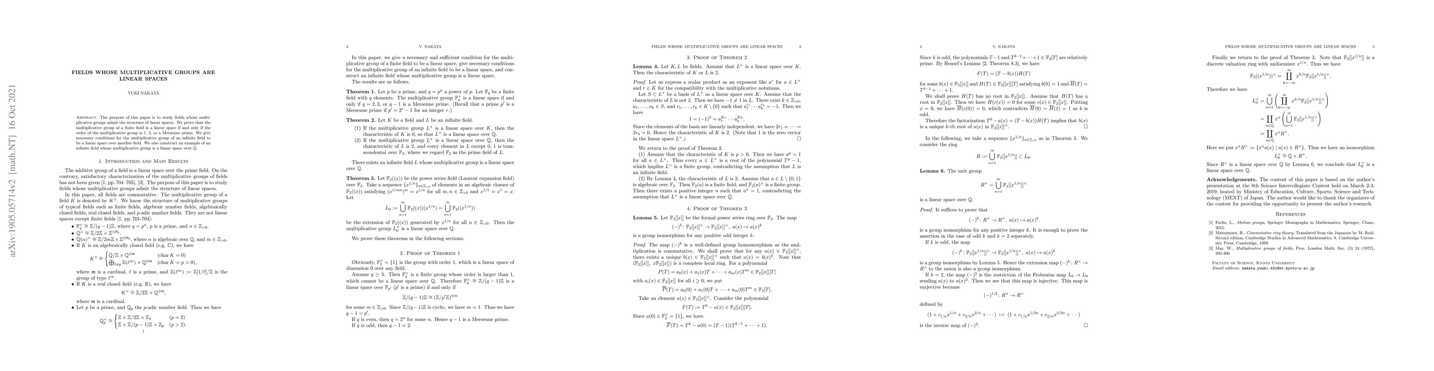 This paper investigates fields where the multiplicative group exhibits linear space structure, proving that for finite fields, this occurs only when the group order is 1, 2, or a Mersenne prime. It also outlines conditions for infinite fields and provides an example of an infinite field with a multiplicative group that is a linear space over $\mathbb{Q}$.