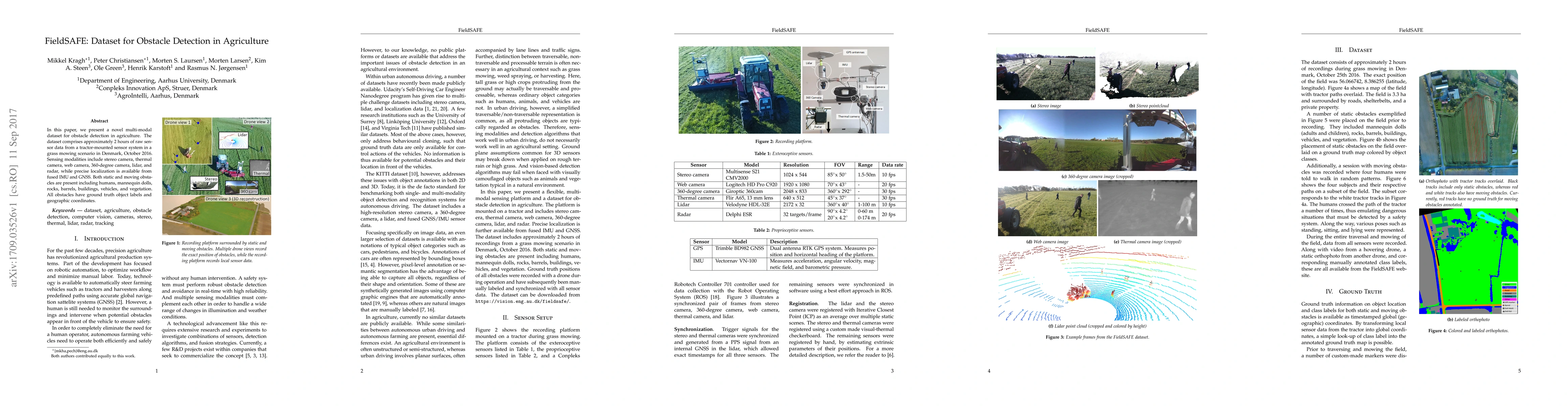In this paper, we present a novel multi-modal dataset for obstacle detection in agriculture. The dataset comprises approximately 2 hours of raw sensor data from a tractor-mounted sensor system in a grass mowing scenario in Denmark, October 2016. Sensing modalities include stereo camera, thermal camera, web camera, 360-degree camera, lidar, and radar, while precise localization is available from fused IMU and GNSS. Both static and moving obstacles are present including humans, mannequin dolls, rocks, barrels, buildings, vehicles, and vegetation. All obstacles have ground truth object labels and geographic coordinates.