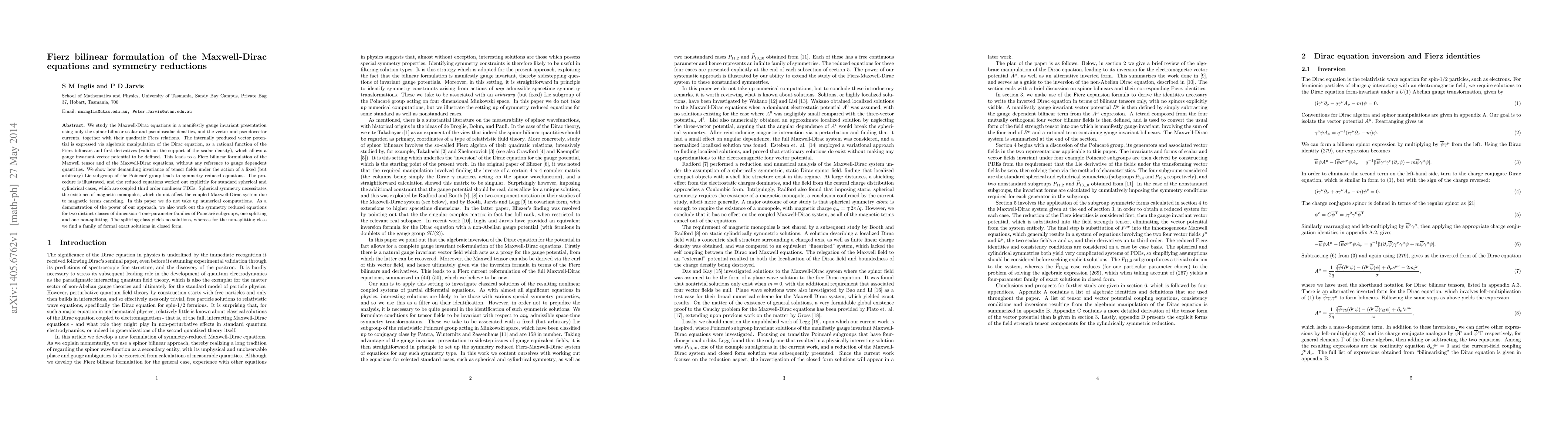 This paper presents a Fierz bilinear formulation of the Maxwell-Dirac equations, ensuring gauge invariance through algebraic manipulation and the use of spinor bilinears. It also explores symmetry reductions via invariance under Lie subgroups of the Poincaré group, leading to coupled third-order nonlinear PDEs, and demonstrates the approach with spherical and cylindrical symmetry reductions.