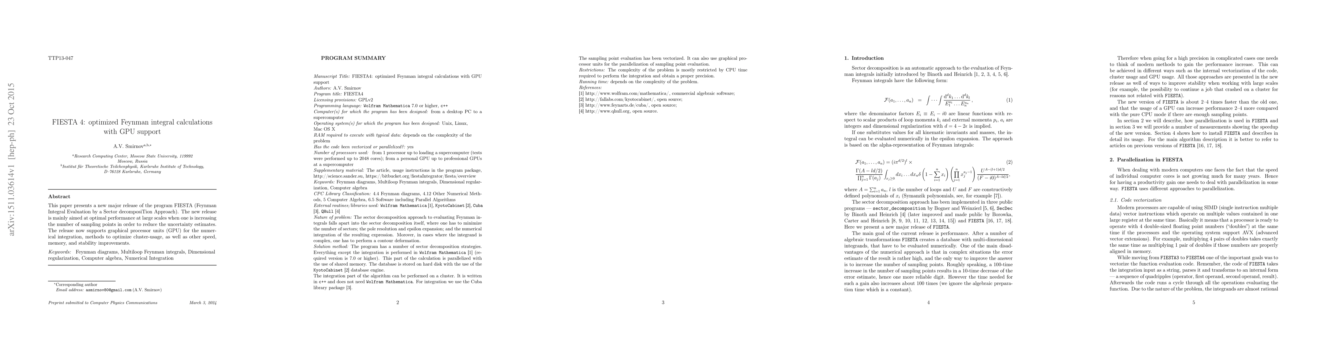 The FIESTA 4 program improves performance at large scales with GPU support for Feynman integral calculations, reducing uncertainty estimates by increasing the number of sampling points.