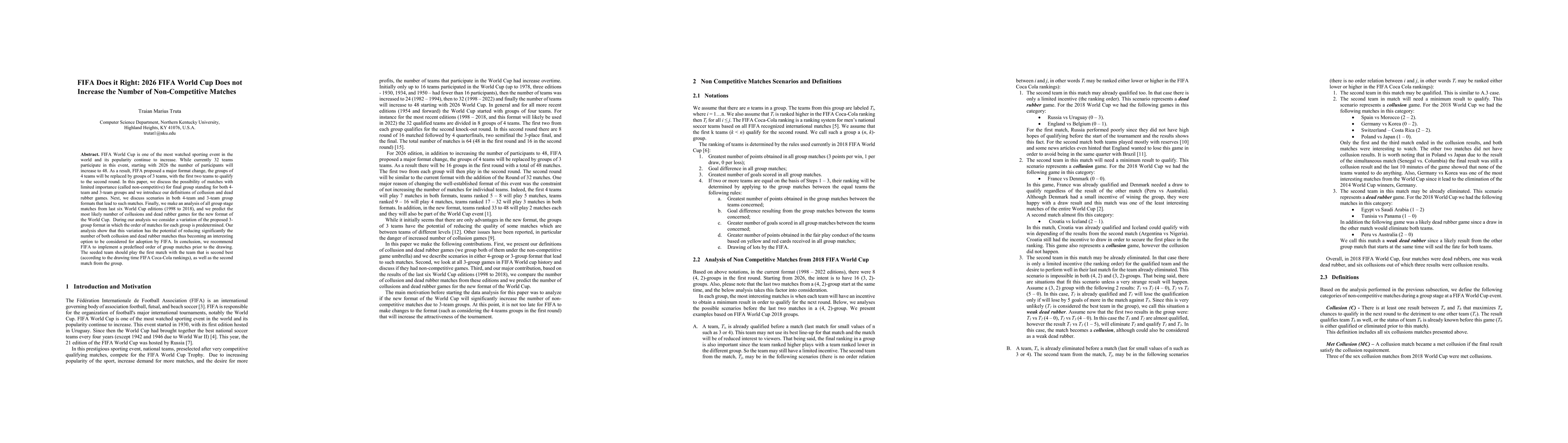 The 2026 FIFA World Cup format change from 32 to 48 teams reduces non-competitive matches through a predefined match order, significantly reducing collusion and dead rubber games.