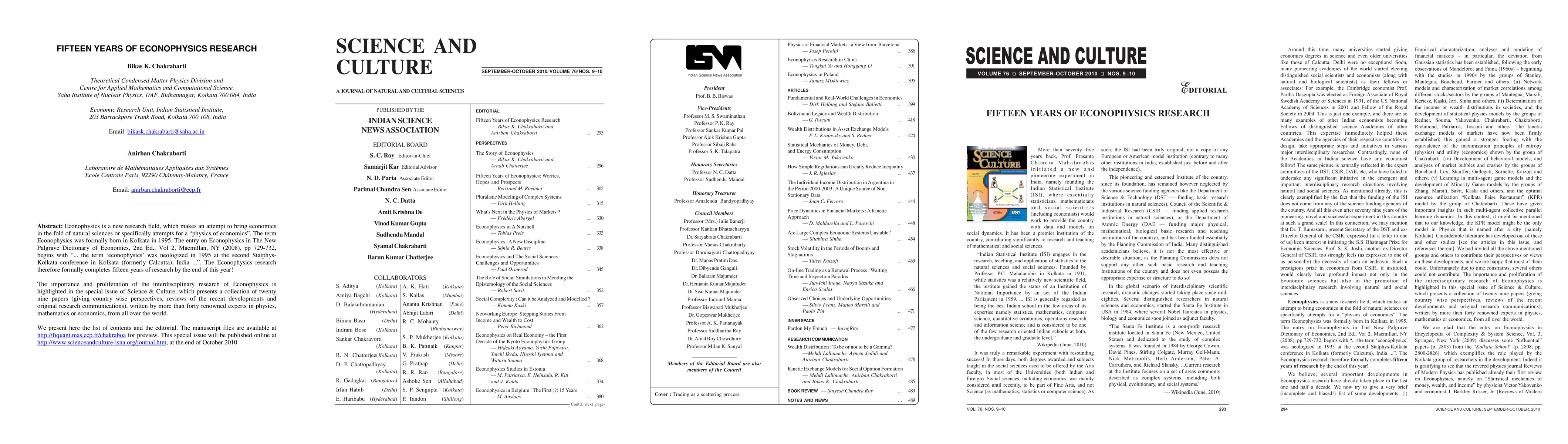 Econophysics is a new research field, which makes an attempt to bring economics in the fold of natural sciences or specifically attempts for a "physics of economics". The term Econophysics was formally born in Kolkata in 1995. The entry on Econophysics in The New Palgrave Dictionary of Economics, 2nd Ed., Vol 2, Macmillan, NY (2008), pp 729-732, begins with "... the term 'econophysics' was neologized in 1995 at the second Statphys- Kolkata conference in Kolkata (formerly Calcutta), India ...". The Econophysics research therefore formally completes fifteen years of research by the end of this year! The importance and proliferation of the interdisciplinary research of Econophysics is highlighted in the special issue of Science & Culture, which presents a collection of twenty nine papers (giving country wise perspectives, reviews of the recent developments and original research communications), written by more than forty renowned experts in physics, mathematics or economics, from all over the world. We present here the list of contents and the editorial. The manuscript files are available at http://fiquant.mas.ecp.fr/chakraboa for preview. This special issue will be published online at http://www.scienceandculture-isna.org/journal.htm, at the end of October 2010.