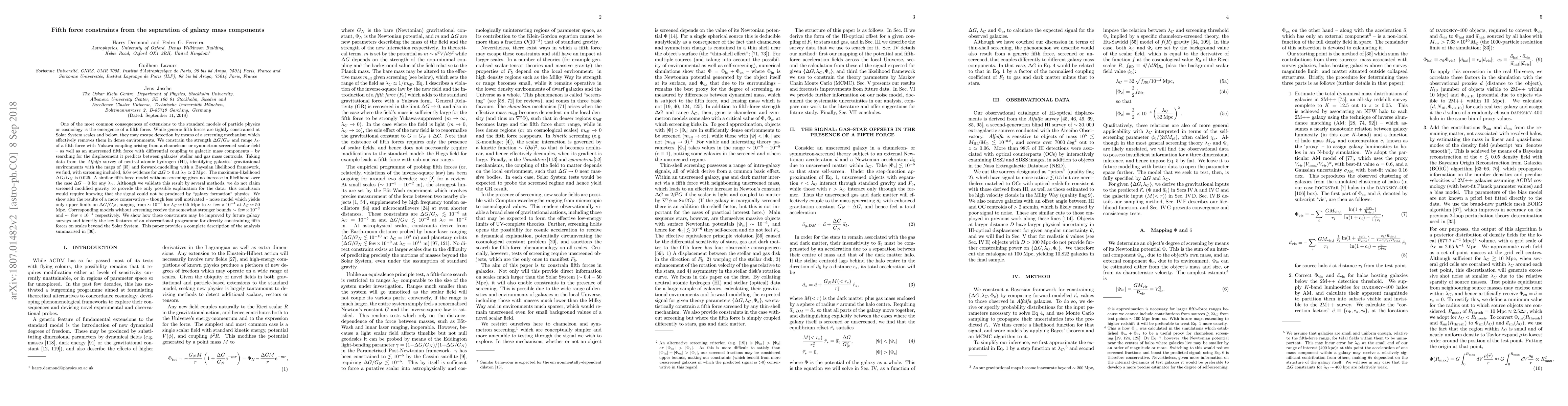 One of the most common consequences of extensions to the standard models of particle physics or cosmology is the emergence of a fifth force. While generic fifth forces are tightly constrained at Solar System scales and below, they may escape detection by means of a screening mechanism which effectively removes them in dense environments. We constrain the strength $\Delta G/G_N$ and range $\lambda_C$ of a chameleon- or symmetron-screened fifth force with Yukawa coupling -- as well as an unscreened fifth force with differential coupling to galactic mass components -- by searching for the displacement it predicts between galaxies' stellar and gas mass centroids. Taking data from the Alfalfa HI survey, identifying galaxies' gravitational environments with the maps of Desmond et al. (2018a) and forward-modelling with a Bayesian likelihood framework, we find $6.6\sigma$ evidence for $\Delta G>0$ at $\lambda_C \simeq 2$ Mpc, with $\Delta G/G_N = 0.025$ at maximum-likelihood. A similar fifth-force model without screening gives no increase in likelihood over the case $\Delta G = 0$ for any $\lambda_C$. Although we validate these results by several methods, we do not claim screened modified gravity to provide the only possible explanation for the signal: this would require knowing that "galaxy formation" physics could not be responsible. We show also the results of a more conservative -- though less well motivated -- noise model which yields only upper limits on $\Delta G/G_N$, ranging from $\sim10^{-1}$ for $\lambda_C \simeq 0.5$ Mpc to $\sim \: \text{few} \times 10^{-4}$ at $\lambda_C \simeq 50$ Mpc. We show how these constraints may be improved by future galaxy surveys and identify the key features of an observational programme for directly constraining fifth forces on galactic scales. This paper provides a complete description of the analysis summarised in Desmond et al. (2018b).