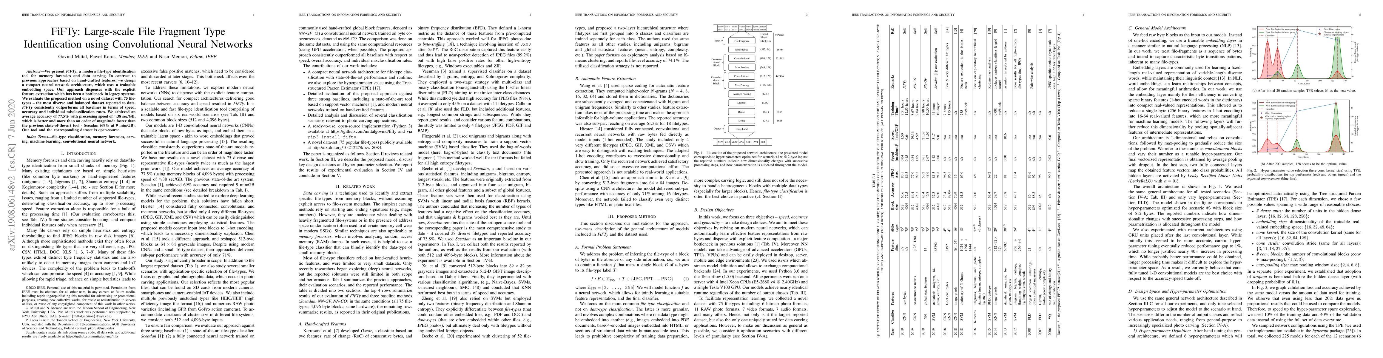 We present FiFTy, a modern file type identification tool for memory forensics and data carving. In contrast to previous approaches based on hand-crafted features, we design a compact neural network architecture, which uses a trainable embedding space, akin to successful natural language processing models. Our approach dispenses with explicit feature extraction which is a bottleneck in legacy systems. We evaluate the proposed method on a novel dataset with 75 file types - the most diverse and balanced dataset reported to date. FiFTy consistently outperforms all baselines in terms of speed, accuracy and individual misclassification rates. We achieved an average accuracy of 77.5% with processing speed of approx 38 sec/GB, which is better and more than an order of magnitude faster than the previous state-of-the-art tool - Sceadan (69% at 9 min/GB). Our tool and the corresponding dataset are available publicly online.